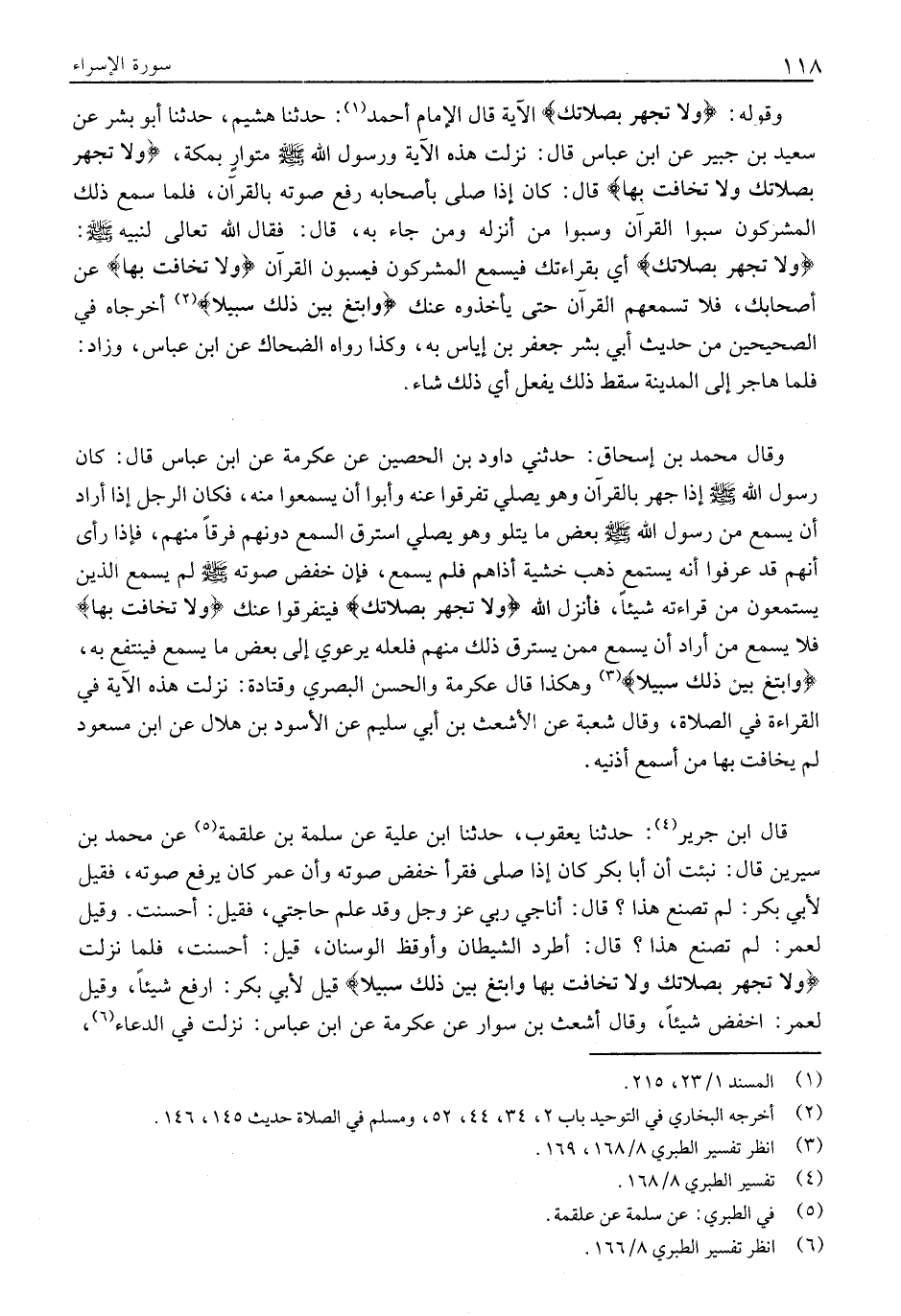 قَالَ ابْنُ جَرِيرٍ «4» : حَدَّثَنَا يَعْقُوبُ، حَدَّثَنَا ابْنُ عُلَيَّةَ عَنْ سَلَمَةُ بْنُ عَلْقَمَةَ «5» عَنْ مُحَمَّدِ بْنِ سِيرِينَ قَالَ: نُبِّئْتُ أَنَّ أَبَا بَكْرٍ كَانَ إِذَا صَلَّى فَقَرَأَ خَفَضَ صَوْتَهُ وَأَنَّ عُمَرَ كَانَ يَرْفَعُ صَوْتَهُ، فَقِيلَ لِأَبِي بَكْرٍ: لِمَ تَصْنَعُ هَذَا؟ قَالَ: أُنَاجِي رَبِّي عَزَّ وَجَلَّ وَقَدْ عَلِمَ حَاجَتِي، فَقِيلَ: أَحْسَنْتَ. وَقِيلَ لِعُمَرَ: لِمَ تَصْنَعُ هَذَا؟ قَالَ: أَطْرُدُ الشَّيْطَانَ وَأُوقِظُ الْوَسْنَانَ، قِيلَ: أَحْسَنْتَ، فَلَمَّا نَزَلَتْ وَلا تَجْهَرْ بِصَلاتِكَ وَلا تُخافِتْ بِها وَابْتَغِ بَيْنَ ذلِكَ سَبِيلًا قِيلَ لِأَبِي بَكْرٍ: ارْفَعْ شَيْئًا، وَقِيلَ لِعُمَرَ: اخْفِضْ شَيْئًا، وَقَالَ أَشْعَثَ بْنِ سَوَّارٍ عَنْ عِكْرِمَةَ عَنِ ابْنِ عباس: نزلت في الدعاء «6» ،