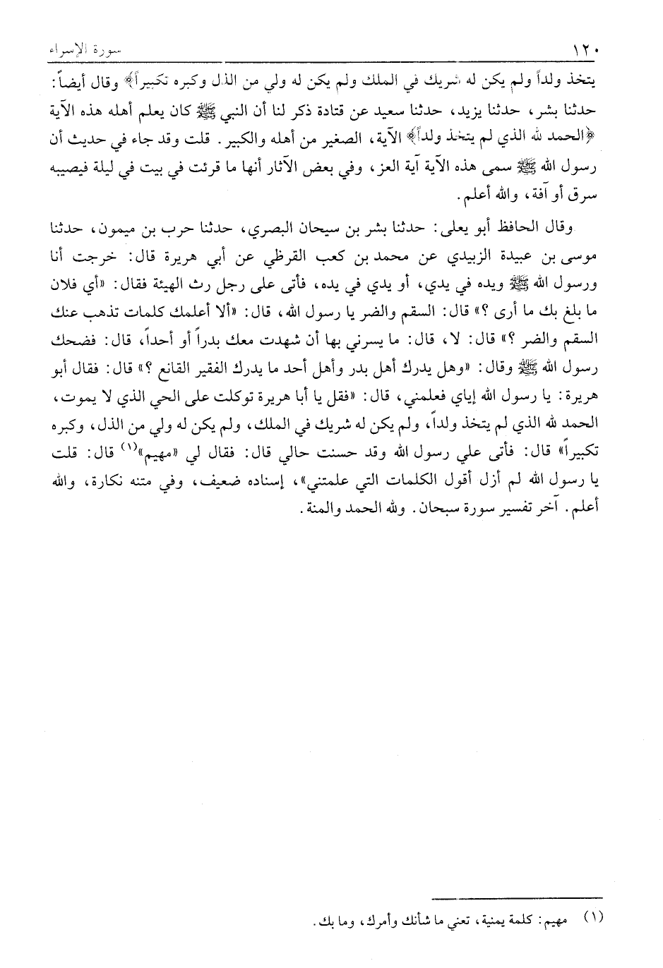 وَقَالَ الْحَافِظُ أَبُو يَعْلَى: حَدَّثَنَا بِشْرُ بْنُ سَيْحَانَ الْبَصْرِيُّ، حَدَّثَنَا حَرْبُ بْنُ مَيْمُونٍ، حَدَّثَنَا مُوسَى بْنُ عُبَيْدَةَ الزبيدي عَنْ مُحَمَّدِ بْنِ كَعْبٍ الْقُرَظِيِّ عَنْ أَبِي هُرَيْرَةَ قَالَ: خَرَجْتُ أَنَا وَرَسُولُ اللَّهِ صَلَّى اللَّهُ عَلَيْهِ وَسَلَّمَ ويده في يدي، أو يدي فِي يَدِهِ، فَأَتَى عَلَى رَجُلٍ رَثِّ الْهَيْئَةِ فَقَالَ: «أَيْ فُلَانُ مَا بَلَغَ بِكَ مَا أَرَى؟» قَالَ: السَّقَمُ وَالضُّرُّ يَا رَسُولَ اللَّهِ، قَالَ: «أَلَّا أُعَلِّمُكَ كَلِمَاتٍ تُذْهِبُ عَنْكَ السَّقَمَ وَالضُّرَّ؟» قَالَ: لَا، قَالَ: مَا يَسُرُّنِي بِهَا أَنْ شَهِدْتُ مَعَكَ بَدْرًا أَوْ أَحَدًا، قَالَ: فَضَحِكَ رَسُولُ اللَّهِ صَلَّى اللَّهُ عَلَيْهِ وَسَلَّمَ وَقَالَ: «وَهَلْ يُدْرِكُ أَهْلُ بَدْرٍ وَأَهْلُ أُحُدٍ مَا يُدْرِكُ الْفَقِيرُ الْقَانِعُ؟» قَالَ: فَقَالَ أَبُو هُرَيْرَةَ: يَا رَسُولَ اللَّهِ إِيَّايَ فَعَلِّمْنِي، قَالَ: «فَقُلْ يَا أَبَا هُرَيْرَةَ تَوَكَّلْتُ عَلَى الْحَيِّ الَّذِي لَا يَمُوتُ، الْحَمْدُ لِلَّهِ الَّذِي لَمْ يَتَّخِذْ وَلَدًا، وَلَمْ يَكُنْ لَهُ شَرِيكٌ فِي الْمُلْكِ، وَلَمْ يَكُنْ لَهُ وَلِيٌّ مِنَ الذُّلِّ، وَكَبِّرْهُ تَكْبِيرًا» قَالَ: فَأَتَى عَلَيَّ رَسُولُ اللَّهِ وَقَدْ حَسُنَتْ حَالِي قَالَ: فَقَالَ لِي «مَهْيَمْ» «1» قَالَ: قُلْتُ يَا رَسُولَ اللَّهِ لَمْ أَزَلْ أَقُولُ الْكَلِمَاتِ الَّتِي عَلَّمْتَنِي» ، إِسْنَادُهُ ضَعِيفٌ، وَفِي متنه نكارة، والله أعلم. آخر تفسير سورة سبحان. ولله الحمد والمنة.