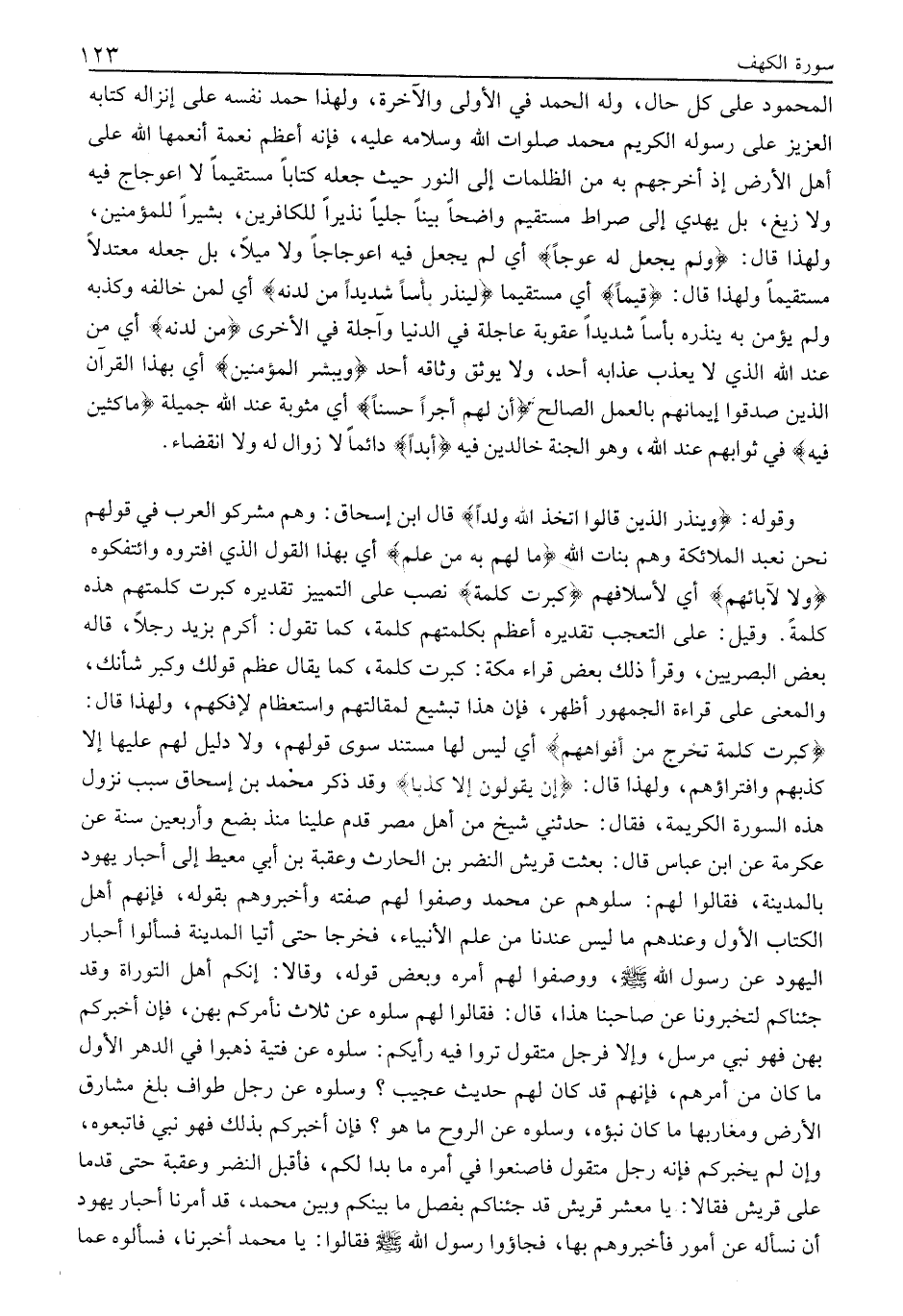 كَبُرَتْ كَلِمَةً تَخْرُجُ مِنْ أَفْواهِهِمْ أَيْ لَيْسَ لَهَا مُسْتَنَدٌ سِوَى قَوْلِهِمْ، وَلَا دَلِيلَ لَهُمْ عَلَيْهَا إِلَّا كَذِبُهُمْ وَافْتِرَاؤُهُمْ، وَلِهَذَا قَالَ: إِنْ يَقُولُونَ إِلَّا كَذِباً وَقَدْ ذَكَرَ مُحَمَّدُ بْنُ إِسْحَاقَ سَبَبَ نُزُولِ هَذِهِ السُّورَةِ الْكَرِيمَةِ، فَقَالَ: حَدَّثَنِي شَيْخٌ مِنْ أَهْلِ مِصْرَ قَدِمَ عَلَيْنَا مُنْذُ بِضْعٍ وَأَرْبَعِينَ سَنَةً عَنْ عِكْرِمَةَ عَنِ ابْنِ عَبَّاسٍ قَالَ: بَعَثَتْ قُرَيْشٌ النَّضْرَ بْنَ الْحَارِثِ وَعُقْبَةَ بْنَ أَبِي مُعَيْطٍ إِلَى أَحْبَارِ يَهُودَ بِالْمَدِينَةِ، فَقَالُوا لَهُمْ: سَلُوهُمْ عَنْ مُحَمَّدٍ وَصِفُوا لَهُمْ صِفَتَهُ وَأَخْبِرُوهُمْ بِقَوْلِهِ، فَإِنَّهُمْ أَهْلُ الْكِتَابِ الْأَوَّلِ وَعِنْدَهُمْ مَا لَيْسَ عندنا من علم الأنبياء، فخرجا حتى أتيا المدينة فسألوا أحبار اليهود عَنْ رَسُولِ اللَّهِ صَلَّى اللَّهُ عَلَيْهِ وَسَلَّمَ، وَوَصَفُوا لَهُمْ أَمْرَهُ وَبَعْضَ قَوْلِهِ، وَقَالَا: إِنَّكُمْ أَهْلُ التَّوْرَاةِ وَقَدْ جِئْنَاكُمْ لِتُخْبِرُونَا عَنْ صَاحِبِنَا هذا، قال: فقالوا لَهُمْ سَلُوهُ عَنْ ثَلَاثٍ نَأْمُرُكُمْ بِهِنَّ، فَإِنْ أخبركم بهن فهو نبي مرسل، وإلا فرجل متقول تروا فِيهِ رَأْيَكُمْ: سَلُوهُ عَنْ فِتْيَةٍ ذَهَبُوا فِي الدَّهْرِ الْأَوَّلِ مَا كَانَ مِنْ أَمْرِهِمْ، فَإِنَّهُمْ قَدْ كَانَ لَهُمْ حَدِيثٌ عَجِيبٌ؟ وَسَلُوهُ عَنْ رَجُلٍ طَوَّافٍ بَلَغَ مَشَارِقَ الْأَرْضِ وَمَغَارِبَهَا مَا كَانَ نَبَؤُهُ، وَسَلُوهُ عَنِ الرُّوحِ مَا هُوَ؟ فَإِنْ أَخْبَرَكُمْ بِذَلِكَ فَهُوَ نَبِيٌّ فَاتَّبِعُوهُ، وَإِنْ لَمْ يُخْبِرْكُمْ فَإِنَّهُ رَجُلٌ مُتَقَوِّلٌ فَاصْنَعُوا فِي أَمْرِهِ مَا بَدَا لَكُمْ، فَأَقْبَلَ النَّضْرُ وَعُقْبَةُ حَتَّى قَدِمَا عَلَى قُرَيْشٍ فَقَالَا: يَا مَعْشَرَ قُرَيْشٍ قَدْ جِئْنَاكُمْ بِفَصْلِ مَا بَيْنَكُمْ وَبَيْنَ مُحَمَّدٍ، قَدْ أَمَرَنَا أَحْبَارُ يَهُودَ أَنْ نَسْأَلَهُ عن أمور فأخبروهم بها، فجاؤوا رَسُولَ اللَّهِ صَلَّى اللَّهُ عَلَيْهِ وَسَلَّمَ فَقَالُوا: يَا مُحَمَّدُ أَخْبِرْنَا، فَسَأَلُوهُ عَمَّا