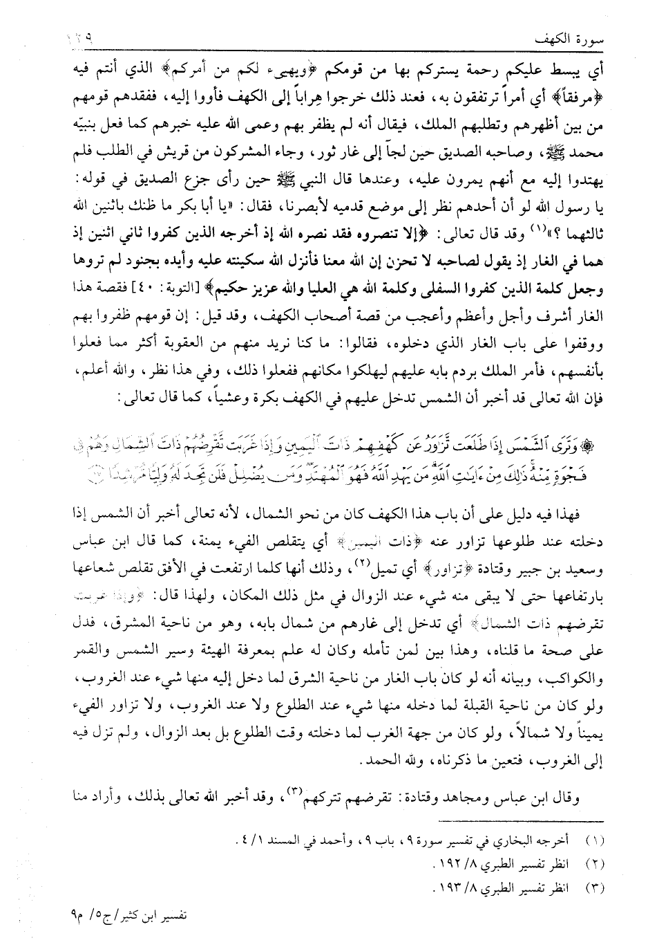 فهذا فيه دليل على أن باب هذا الكهف كان مِنْ نَحْوِ الشَّمَالِ، لِأَنَّهُ تَعَالَى أَخْبَرَ أَنَّ الشَّمْسَ إِذَا دَخَلَتْهُ عِنْدَ طُلُوعِهَا تَزَاوَرُ عَنْهُ ذاتَ الْيَمِينِ أَيْ يَتَقَلَّصُ الْفَيْءُ يَمْنَةً، كَمَا قَالَ ابْنُ عَبَّاسٍ وَسَعِيدُ بْنُ جُبَيْرٍ وَقَتَادَةُ تَتَزاوَرُ أَيْ تَمِيلُ «2» ، وَذَلِكَ أَنَّهَا كُلَّمَا ارْتَفَعَتْ فِي الْأُفُقِ تَقَلَّصَ شُعَاعُهَا بِارْتِفَاعِهَا حَتَّى لَا يَبْقَى مِنْهُ شَيْءٌ عِنْدَ الزَّوَالِ فِي مِثْلِ ذَلِكَ الْمَكَانِ، وَلِهَذَا قَالَ: وَإِذا غَرَبَتْ تَقْرِضُهُمْ ذاتَ الشِّمالِ أَيْ تَدْخُلُ إِلَى غَارِهِمْ مِنْ شِمَالِ بَابِهِ، وَهُوَ مِنْ نَاحِيَةِ الْمَشْرِقِ، فَدَلَّ عَلَى صِحَّةِ مَا قُلْنَاهُ، وَهَذَا بَيِّنٌ لِمَنْ تَأَمَّلَهُ وَكَانَ لَهُ عِلْمٌ بِمَعْرِفَةِ الْهَيْئَةِ وَسَيْرِ الشَّمْسِ وَالْقَمَرِ وَالْكَوَاكِبِ، وَبَيَانُهُ أَنَّهُ لَوْ كَانَ بَابُ الْغَارِ مِنْ نَاحِيَةِ الشَّرْقِ لَمَا دَخَلَ إِلَيْهِ مِنْهَا شَيْءٌ عِنْدَ الْغُرُوبِ، وَلَوْ كَانَ مِنْ ناحية القبلة لما دخله مِنْهَا شَيْءٌ عِنْدَ الطُّلُوعِ وَلَا عِنْدَ الْغُرُوبِ، وَلَا تَزَاوَرَ الْفَيْءُ يَمِينًا وَلَا شِمَالًا، وَلَوْ كَانَ مِنْ جِهَةِ الْغَرْبِ لَمَا دَخَلَتْهُ وَقْتَ الطُّلُوعِ بَلْ بَعْدَ الزَّوَالِ، وَلَمْ تَزَلْ فِيهِ إِلَى الْغُرُوبِ، فَتَعَيَّنَ مَا ذَكَرْنَاهُ، وَلِلَّهِ الْحَمْدُ.