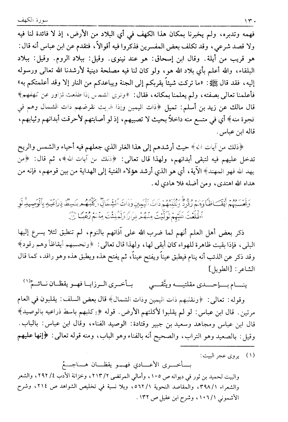 هُوَ قَرِيبٌ مِنْ أَيْلَةَ. وَقَالَ ابْنُ إِسْحَاقَ: هُوَ عِنْدَ نِينَوَى. وَقِيلَ: بِبِلَادِ الرُّومِ. وَقِيلَ: بِبِلَادِ الْبَلْقَاءِ، وَاللَّهُ أَعْلَمُ بِأَيِّ بِلَادِ اللَّهِ هُوَ، وَلَوْ كَانَ لَنَا فِيهِ مَصْلَحَةٌ دِينِيَّةٌ لَأَرْشَدْنَا اللَّهُ تعالى ورسوله إليه، فقد قال صَلَّى اللَّهُ عَلَيْهِ وَسَلَّمَ: «مَا تَرَكْتُ شَيْئًا يُقَرِّبُكُمْ إِلَى الْجَنَّةِ وَيُبَاعِدُكُمْ مِنَ النَّارِ إِلَّا وَقَدْ أَعْلَمْتُكُمْ بِهِ» فَأَعْلَمَنَا تَعَالَى بِصِفَتِهِ، وَلَمْ يُعْلِمْنَا بِمَكَانِهِ، فَقَالَ: وَتَرَى الشَّمْسَ إِذا طَلَعَتْ تَتَزاوَرُ عَنْ كَهْفِهِمْ قَالَ مَالِكٌ عَنْ زَيْدِ بْنِ أَسْلَمَ: تَمِيلُ ذاتَ الْيَمِينِ وَإِذا غَرَبَتْ تَقْرِضُهُمْ ذاتَ الشِّمالِ وَهُمْ فِي فَجْوَةٍ مِنْهُ أَيْ في متسع منه داخلا بحيث لا تصبيهم، إِذْ لَوْ أَصَابَتْهُمْ لَأَحْرَقَتْ أَبْدَانَهُمْ وَثِيَابَهُمْ، قَالَهُ ابْنُ عَبَّاسٍ.