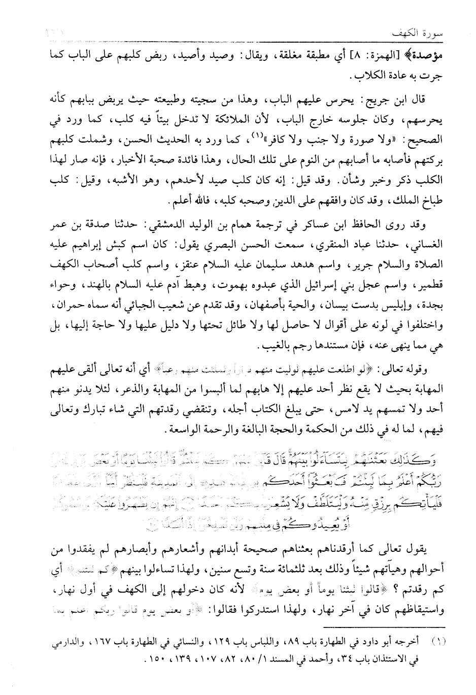 قَالَ ابْنُ جُرَيْجٍ: يَحْرُسُ عَلَيْهِمُ الْبَابَ، وَهَذَا مِنْ سَجِيَّتِهِ وَطَبِيعَتِهِ حَيْثُ يَرْبِضُ بِبَابِهِمْ كَأَنَّهُ يَحْرُسُهُمْ، وَكَانَ جُلُوسُهُ خَارِجَ الْبَابِ، لِأَنَّ الْمَلَائِكَةَ لَا تَدْخُلُ بَيْتًا فِيهِ كَلْبٌ، كَمَا وَرَدَ فِي الصَّحِيحِ: «وَلَا صُورَةٌ وَلَا جُنُبٌ وَلَا كَافِرٌ» «1» ، كَمَا وَرَدَ بِهِ الْحَدِيثُ الْحَسَنُ، وَشَمَلَتْ كَلْبَهُمْ بَرَكَتُهُمْ فَأَصَابَهُ مَا أَصَابَهُمْ مِنَ النَّوْمِ عَلَى تِلْكَ الْحَالِ، وَهَذَا فَائِدَةُ صحبة الأخبار، فَإِنَّهُ صَارَ لِهَذَا الْكَلْبِ ذِكْرٌ وَخَبَرٌ وَشَأْنٌ. وَقَدْ قِيلَ: إِنَّهُ كَانَ كَلْبَ صَيْدٍ لِأَحَدِهِمْ، وهو الأشبه، وقيل: كَلْبَ طَبَّاخِ الْمَلِكِ، وَقَدْ كَانَ وَافَقَهُمْ عَلَى الدين وصحبه كَلْبُهُ، فَاللَّهُ أَعْلَمُ.