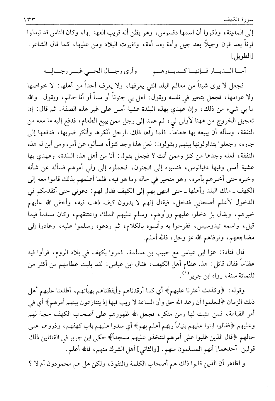 قَالَ قَتَادَةُ: غَزَا ابْنُ عَبَّاسٍ مَعَ حَبِيبِ بْنِ مَسْلَمَةَ، فَمَرُّوا بِكَهْفٍ فِي بِلَادِ الرُّومِ، فَرَأَوْا فِيهِ عِظَامًا فَقَالَ قَائِلٌ: هَذِهِ عِظَامُ أَهْلِ الْكَهْفِ، فَقَالَ ابْنُ عَبَّاسٍ: لَقَدْ بَلِيَتْ عِظَامُهُمْ مِنْ أَكْثَرِ مِنْ ثَلَاثِمِائَةِ سَنَةٍ، رَوَاهُ ابْنُ جَرِيرٍ.