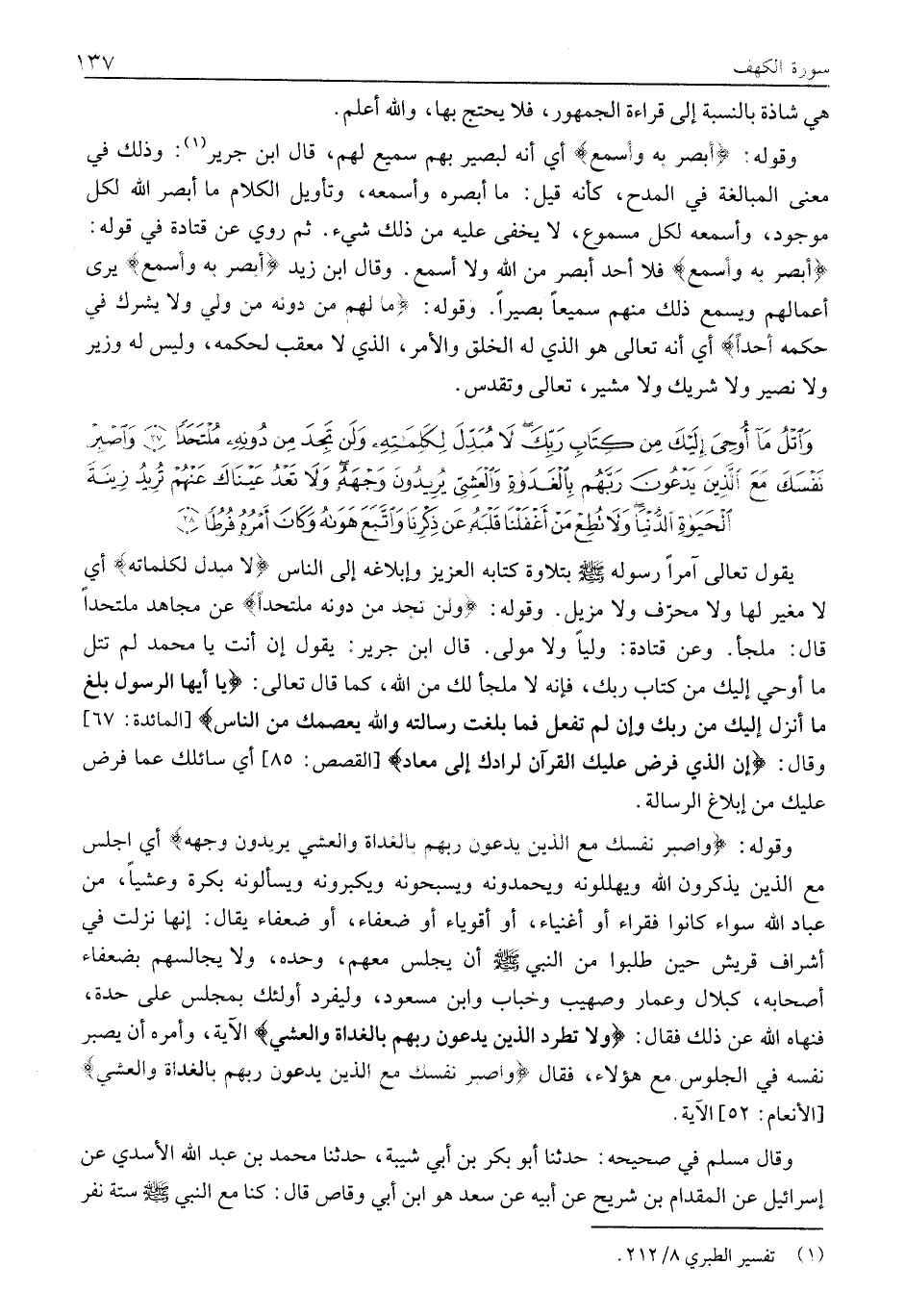 وَاتْلُ مَا أُوحِيَ إِلَيْكَ مِنْ كِتابِ رَبِّكَ لَا مُبَدِّلَ لِكَلِماتِهِ وَلَنْ تَجِدَ مِنْ دُونِهِ مُلْتَحَداً (27) وَاصْبِرْ نَفْسَكَ مَعَ الَّذِينَ يَدْعُونَ رَبَّهُمْ بِالْغَداةِ وَالْعَشِيِّ يُرِيدُونَ وَجْهَهُ وَلا تَعْدُ عَيْناكَ عَنْهُمْ تُرِيدُ زِينَةَ الْحَياةِ الدُّنْيا وَلا تُطِعْ مَنْ أَغْفَلْنا قَلْبَهُ عَنْ ذِكْرِنا وَاتَّبَعَ هَواهُ وَكانَ أَمْرُهُ فُرُطاً (28)