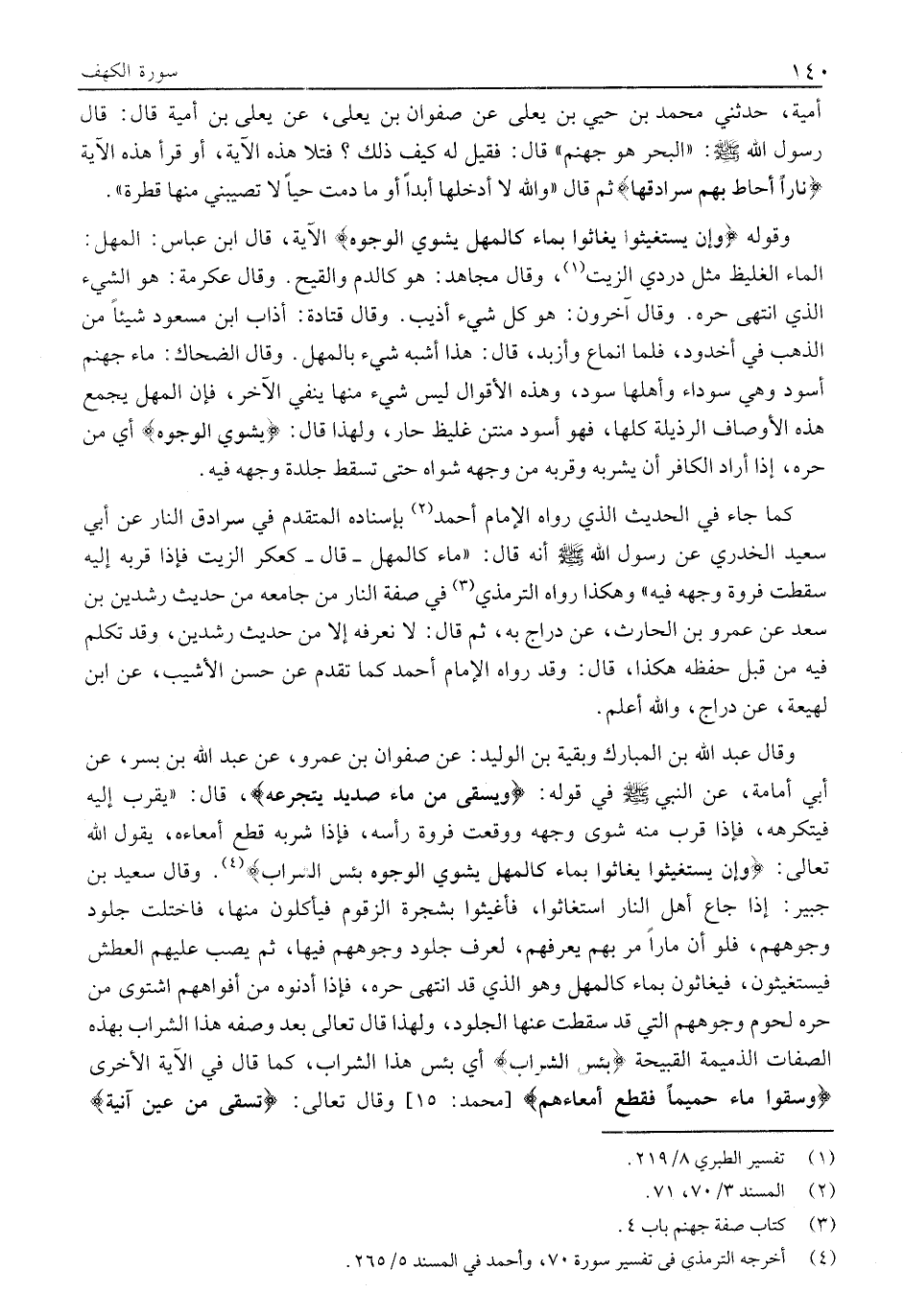 أُمَيَّةَ، حَدَّثَنِي مُحَمَّدُ بْنُ حُيَيِّ بْنِ يَعْلَى عَنْ صَفْوَانَ بْنِ يَعْلَى، عَنْ يَعْلَى بْنِ أُمَيَّةَ قَالَ: قَالَ رَسُولُ اللَّهِ صَلَّى اللَّهُ عَلَيْهِ وَسَلَّمَ: «الْبَحْرُ هُوَ جَهَنَّمُ» قَالَ: فَقِيلَ لَهُ كَيْفَ ذَلِكَ؟ فَتَلَا هَذِهِ الْآيَةَ، أَوْ قَرَأَ هَذِهِ الْآيَةَ نَارًا أَحاطَ بِهِمْ سُرادِقُها ثُمَّ قَالَ «وَاللَّهِ لَا أَدْخُلُهَا أَبَدًا أَوْ ما دمت حيا لا تُصِيبُنِي مِنْهَا قَطْرَةٌ» .