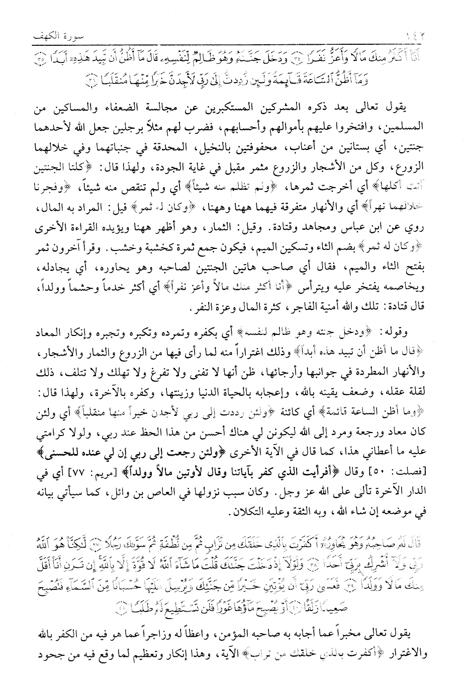 يَقُولُ تعالى بعد ذكره الْمُشْرِكِينَ الْمُسْتَكْبِرِينَ عَنْ مُجَالَسَةِ الضُّعَفَاءِ وَالْمَسَاكِينِ مِنَ الْمُسْلِمِينَ، وَافْتَخَرُوا عَلَيْهِمْ بِأَمْوَالِهِمْ وَأَحْسَابِهِمْ، فَضَرَبَ لَهُمْ مَثَلًا بِرَجُلَيْنِ جَعَلَ اللَّهُ لِأَحَدِهِمَا جَنَّتَيْنِ، أَيْ بستانين من أعناب، محفوفتين بالنخيل، الْمُحْدِقَةِ فِي جَنْبَاتِهِمَا وَفِي خِلَالِهِمَا الزُّرُوعُ، وَكُلٌّ مِنَ الْأَشْجَارِ وَالزُّرُوعِ مُثْمِرٌ مُقْبِلٌ فِي غَايَةِ الجودة، وَلِهَذَا قَالَ: كِلْتَا الْجَنَّتَيْنِ آتَتْ أُكُلَها أَيْ أخرجت ثَمَرُهَا، وَلَمْ تَظْلِمْ مِنْهُ شَيْئاً أَيْ وَلَمْ تَنْقُصْ مِنْهُ شَيْئًا، وَفَجَّرْنا خِلالَهُما نَهَراً أَيْ والأنهار متفرقة فِيهِمَا هَاهُنَا وَهَاهُنَا، وَكانَ لَهُ ثَمَرٌ قِيلَ: الْمُرَادُ بِهِ الْمَالُ، رُوِيَ عَنِ ابْنِ عَبَّاسٍ وَمُجَاهِدٍ وَقَتَادَةَ. وَقِيلَ: الثِّمَارُ، وَهُوَ أَظْهَرُ هَاهُنَا وَيُؤَيِّدُهُ الْقِرَاءَةُ الْأُخْرَى وَكانَ لَهُ ثَمَرٌ بِضَمِّ الثَّاءِ وَتَسْكِينِ الْمِيمِ، فَيَكُونُ جَمْعَ ثَمَرَةٍ كَخَشَبَةٍ وَخُشْبٍ. وَقَرَأَ آخَرُونَ ثَمَرٌ بِفَتْحِ الثَّاءِ وَالْمِيمِ، فَقَالَ أَيْ صَاحِبُ هَاتَيْنِ الْجَنَّتَيْنِ لِصَاحِبِهِ وَهُوَ يُحَاوِرُهُ، أَيْ يُجَادِلُهُ، وَيُخَاصِمُهُ يَفْتَخِرُ عَلَيْهِ وَيَتَرَأَّسُ أَنَا أَكْثَرُ مِنْكَ مَالًا وَأَعَزُّ نَفَراً أَيْ أَكْثَرُ خَدَمًا وَحَشَمًا وَوَلَدًا، قَالَ قَتَادَةُ: تِلْكَ وَاللَّهِ أُمْنِيَةُ الْفَاجِرِ، كَثْرَةُ الْمَالِ وَعِزَّةُ النَّفَرِ.