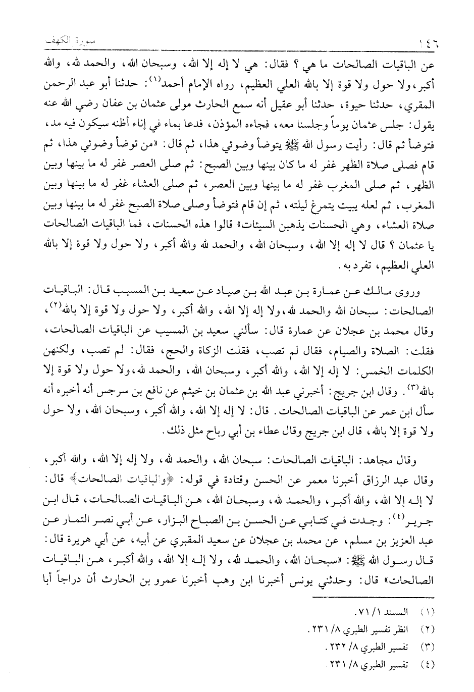 عَنْ الْبَاقِيَاتُ الصَّالِحَاتُ مَا هِيَ؟ فَقَالَ: هِيَ لَا إِلَهَ إِلَّا اللَّهُ، وَسُبْحَانَ اللَّهِ، وَالْحَمْدُ لله، وَاللَّهُ أَكْبَرُ، وَلَا حَوْلَ وَلَا قُوَّةَ إِلَّا بِاللَّهِ الْعَلِيِّ الْعَظِيمِ، رَوَاهُ الْإِمَامُ أَحْمَدُ «1» : حَدَّثَنَا أَبُو عَبْدِ الرَّحْمَنِ المقري، حدثنا حيوة، حدثنا أَبُو عَقِيلٍ أَنَّهُ سَمِعَ الْحَارِثَ مَوْلَى عُثْمَانَ بن عفان رَضِيَ اللَّهُ عَنْهُ يَقُولُ: جَلَسَ عُثْمَانُ يَوْمًا وَجَلَسْنَا مَعَهُ، فَجَاءَهُ الْمُؤَذِّنُ، فَدَعَا بِمَاءٍ فِي إناء أظنه سَيَكُونُ فِيهِ مُدٌّ، فَتَوَضَّأَ ثُمَّ قَالَ: رَأَيْتُ رَسُولَ اللَّهِ صَلَّى اللَّهُ عَلَيْهِ وَسَلَّمَ يَتَوَضَّأُ وُضُوئِي هَذَا، ثُمَّ قَالَ: «مَنْ تَوَضَّأَ وُضُوئِي هَذَا، ثُمَّ قَامَ فَصَلَّى صَلَاةَ الظُّهْرِ غُفِرَ لَهُ مَا كَانَ بَيْنَهَا وَبَيْنَ الصُّبْحِ: ثُمَّ صَلَّى الْعَصْرَ غُفِرَ لَهُ مَا بَيَّنَهَا وَبَيْنَ الظُّهْرِ، ثُمَّ صَلَّى الْمَغْرِبَ غُفِرَ لَهُ مَا بَيَّنَهَا وَبَيْنَ الْعَصْرِ، ثُمَّ صَلَّى الْعَشَاءَ غُفِرَ لَهُ مَا بَيْنَهَا وَبَيْنَ الْمَغْرِبِ، ثُمَّ لَعَلَّهُ يَبِيتُ يَتَمَرَّغُ لَيْلَتَهُ، ثُمَّ إِنْ قَامَ فَتَوَضَّأَ وَصَلَّى صَلَاةَ الصُّبْحِ غُفِرَ لَهُ مَا بَيَّنَهَا وَبَيْنَ صَلَاةِ الْعِشَاءِ، وَهِيَ الْحَسَنَاتُ يُذْهِبْنَ السَّيِّئَاتِ» قَالُوا هَذِهِ الْحَسَنَاتُ، فَمَا الْبَاقِيَاتِ الصَّالِحَاتُ يَا عثمان؟ قال لَا إِلَهَ إِلَّا اللَّهُ، وَسُبْحَانَ اللَّهِ، وَالْحَمْدُ لله وَاللَّهُ أَكْبَرُ، وَلَا حَوْلَ وَلَا قُوَّةَ إِلَّا بِاللَّهِ الْعَلِيِّ الْعَظِيمِ، تَفَرَّدَ بِهِ.