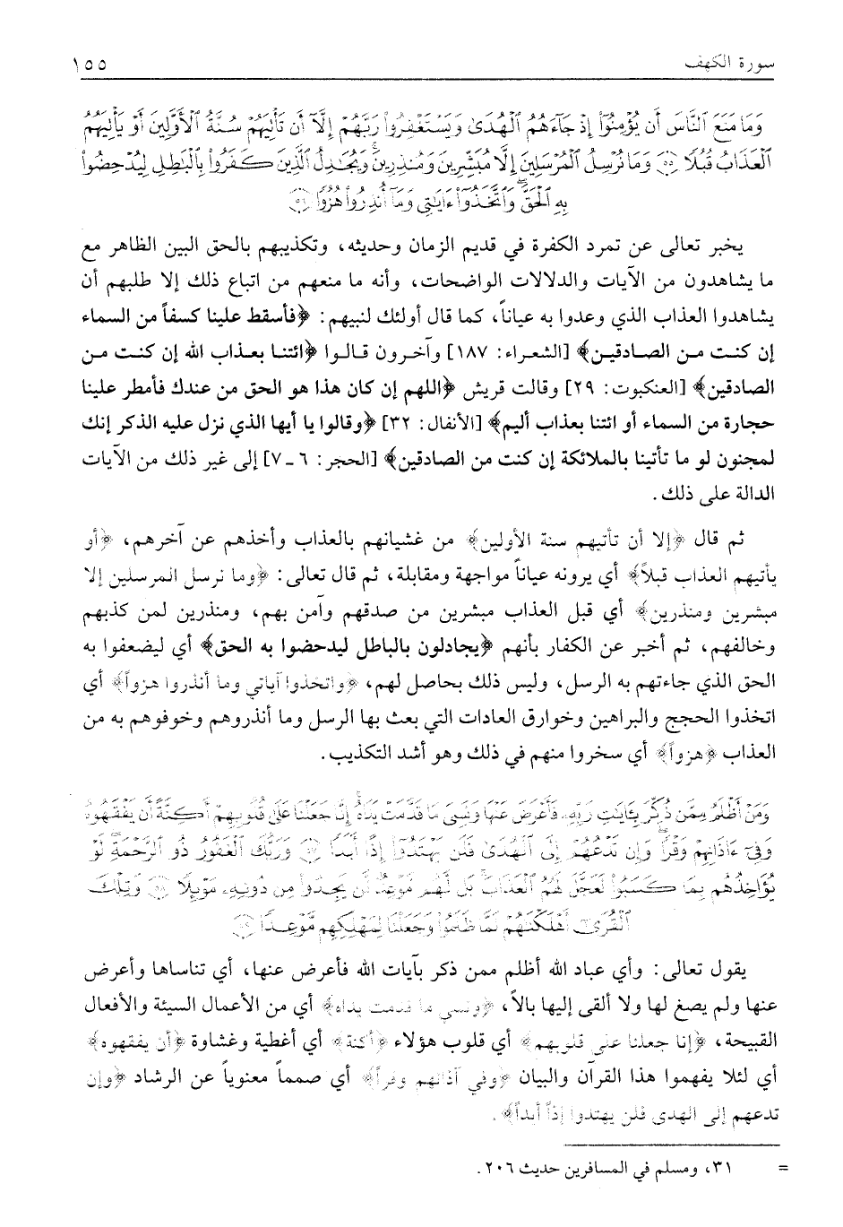 وَما مَنَعَ النَّاسَ أَنْ يُؤْمِنُوا إِذْ جاءَهُمُ الْهُدى وَيَسْتَغْفِرُوا رَبَّهُمْ إِلاَّ أَنْ تَأْتِيَهُمْ سُنَّةُ الْأَوَّلِينَ أَوْ يَأْتِيَهُمُ الْعَذابُ قُبُلاً (55) وَما نُرْسِلُ الْمُرْسَلِينَ إِلاَّ مُبَشِّرِينَ وَمُنْذِرِينَ وَيُجادِلُ الَّذِينَ كَفَرُوا بِالْباطِلِ لِيُدْحِضُوا بِهِ الْحَقَّ وَاتَّخَذُوا آياتِي وَما أُنْذِرُوا هُزُواً (56)