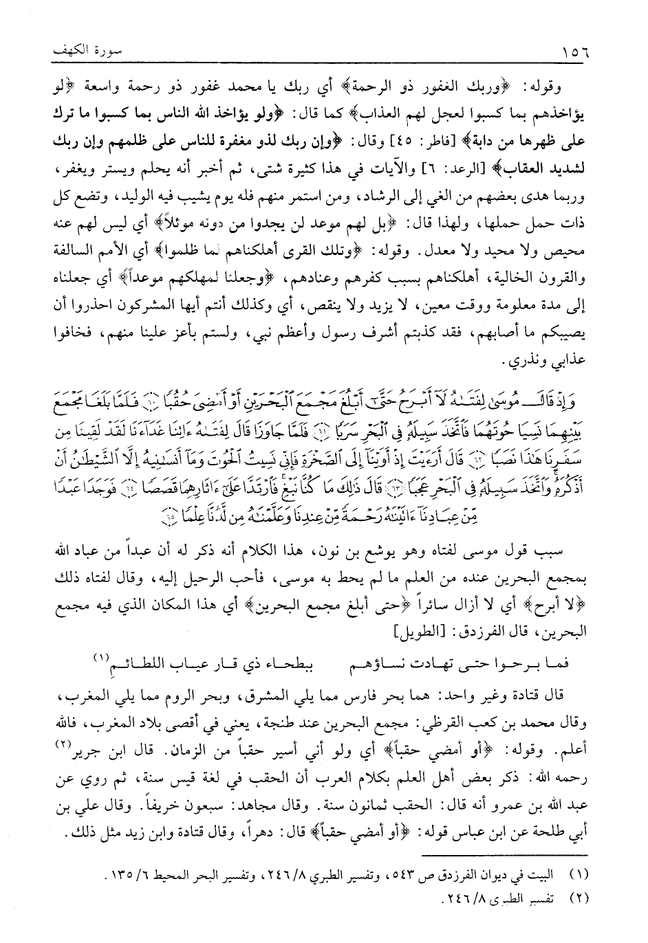 قَالَ قَتَادَةُ وَغَيْرُ وَاحِدٍ: هما بَحْرُ فَارِسَ مِمَّا يَلِي الْمَشْرِقَ، وَبَحْرُ الرُّومِ مِمَّا يَلِي الْمَغْرِبَ، وَقَالَ مُحَمَّدُ بْنُ كَعْبٍ الْقُرَظِيُّ: مَجْمَعُ الْبَحْرَيْنِ عِنْدَ طَنْجَةَ، يَعْنِي فِي أَقْصَى بِلَادِ الْمَغْرِبِ، فَاللَّهُ أَعْلَمُ. وَقَوْلُهُ: أَوْ أَمْضِيَ حُقُباً أَيْ وَلَوْ أَنِّي أَسِيرُ حُقُبًا مِنَ الزَّمَانِ. قَالَ ابْنُ جَرِيرٍ «2» رَحِمَهُ اللَّهُ: ذَكَرَ بَعْضُ أَهْلِ الْعِلْمِ بِكَلَامِ الْعَرَبِ أَنَّ الحقب في لغة قيس سنة، ثم رُوِيَ عَنْ عَبْدِ اللَّهِ بْنِ عَمْرٍو أَنَّهُ قَالَ: الْحُقُبُ ثَمَانُونَ سَنَةً. وَقَالَ مُجَاهِدٌ: سَبْعُونَ خَرِيفًا. وَقَالَ عَلِيُّ بْنُ أَبِي طَلْحَةَ عَنِ ابْنِ عَبَّاسٍ قَوْلُهُ: أَوْ أَمْضِيَ حُقُباً قَالَ: دَهْرًا، وَقَالَ قَتَادَةُ وَابْنُ زَيْدٍ مِثْلَ ذَلِكَ.