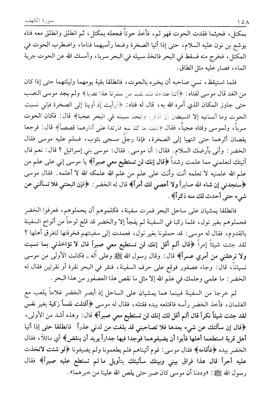 فَلَمَّا اسْتَيْقَظَ، نَسِيَ صَاحِبُهُ أَنْ يُخْبِرَهُ بِالْحُوتِ، فَانْطَلَقَا بَقِيَّةَ يَوْمِهِمَا وَلَيْلَتِهِمَا حَتَّى إِذَا كَانَ مِنَ الْغَدِ قَالَ مُوسَى لِفَتَاهُ: آتِنا غَداءَنا لَقَدْ لَقِينا مِنْ سَفَرِنا هَذَا نَصَباً وَلَمْ يجد موسى النصب حتى جاوز الْمَكَانَ الَّذِي أَمَرَهُ اللَّهُ بِهِ، قَالَ لَهُ فَتَاهُ: أَرَأَيْتَ إِذْ أَوَيْنا إِلَى الصَّخْرَةِ فَإِنِّي نَسِيتُ الْحُوتَ وَما أَنْسانِيهُ إِلَّا الشَّيْطانُ أَنْ أَذْكُرَهُ وَاتَّخَذَ سَبِيلَهُ فِي الْبَحْرِ عَجَباً قَالَ: فكان الحوت سَرَبًا، وَلِمُوسَى وَفَتَاهُ عَجَبًا، فَقَالَ ذلِكَ مَا كُنَّا نَبْغِ فَارْتَدَّا عَلى آثارِهِما قَصَصاً قَالَ: فَرَجَعَا يَقُصَّانِ أَثَرَهُمَا حَتَّى انْتَهَيَا إِلَى الصَّخْرَةِ، فَإِذَا رَجُلٌ مُسَجًّى بِثَوْبٍ، فَسَلَّمَ عَلَيْهِ مُوسَى فقال الخضر: وأنى بأرضك السلام. فقال: أنا موسى. فقال: موسى بني إسرائيل؟ قال: نعم قال أَتَيْتُكَ لِتُعَلِّمَنِي مِمَّا عُلِّمْتَ رُشْدًا قالَ إِنَّكَ لَنْ تَسْتَطِيعَ مَعِيَ صَبْراً يَا مُوسَى إِنِّي عَلَى عِلْمٍ مَنْ عِلْمِ اللَّهِ عَلَّمَنِيهِ لَا تَعْلَمُهُ أَنْتَ وَأَنْتَ عَلَى عِلْمٍ مَنْ عِلْمِ اللَّهِ عَلَّمَكَهُ اللَّهُ لَا أَعْلَمُهُ. فَقَالَ مُوسَى سَتَجِدُنِي إِنْ شاءَ اللَّهُ صابِراً وَلا أَعْصِي لَكَ أَمْراً قَالَ لَهُ الْخَضِرُ: فَإِنِ اتَّبَعْتَنِي فَلا تَسْئَلْنِي عَنْ شَيْءٍ حَتَّى أُحْدِثَ لَكَ مِنْهُ ذِكْراً.