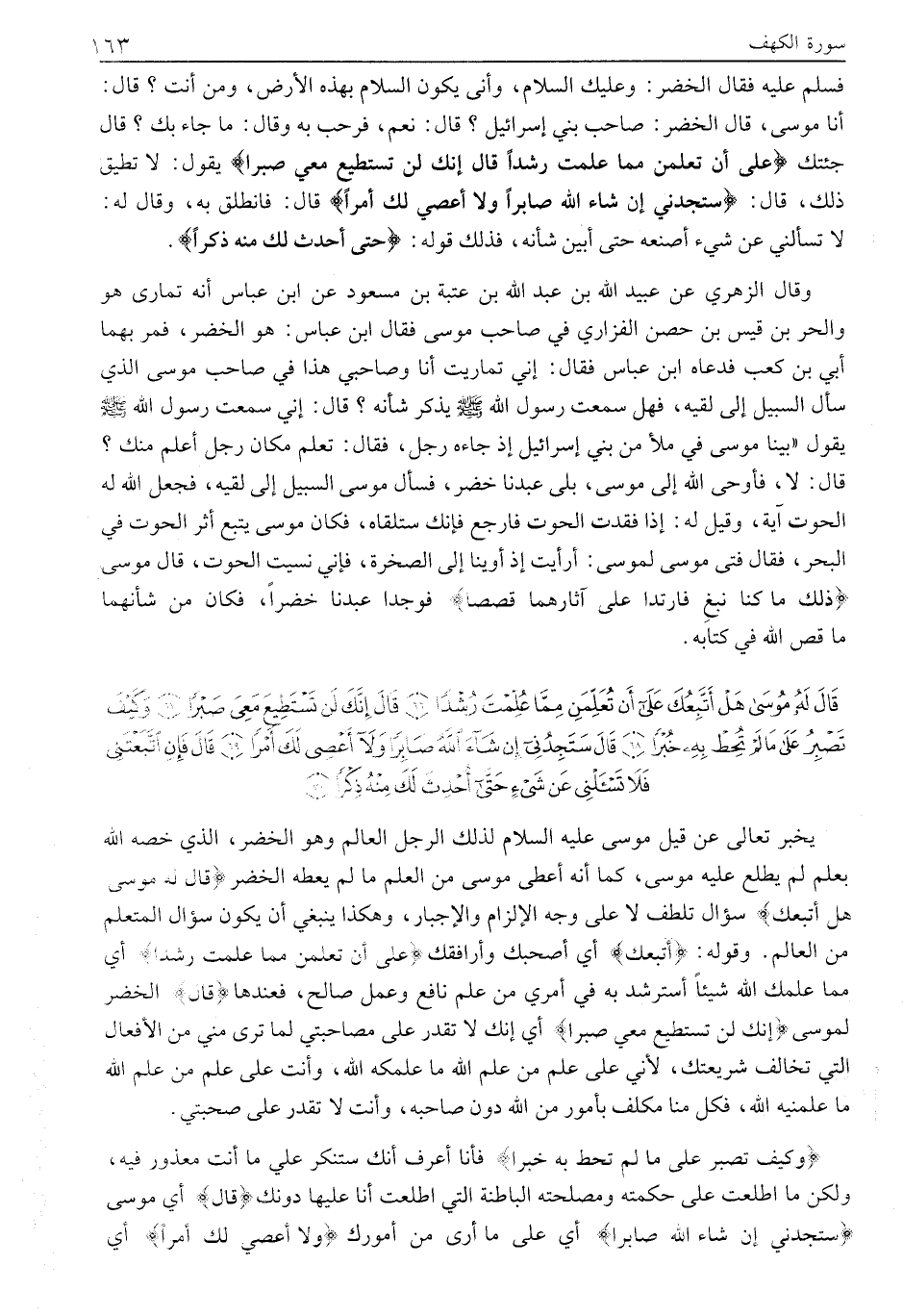 قالَ لَهُ مُوسى هَلْ أَتَّبِعُكَ عَلى أَنْ تُعَلِّمَنِ مِمَّا عُلِّمْتَ رُشْداً (66) قالَ إِنَّكَ لَنْ تَسْتَطِيعَ مَعِيَ صَبْراً (67) وَكَيْفَ تَصْبِرُ عَلى مَا لَمْ تُحِطْ بِهِ خُبْراً (68) قالَ سَتَجِدُنِي إِنْ شاءَ اللَّهُ صابِراً وَلا أَعْصِي لَكَ أَمْراً (69) قالَ فَإِنِ اتَّبَعْتَنِي فَلا تَسْئَلْنِي عَنْ شَيْءٍ حَتَّى أُحْدِثَ لَكَ مِنْهُ ذِكْراً (70)