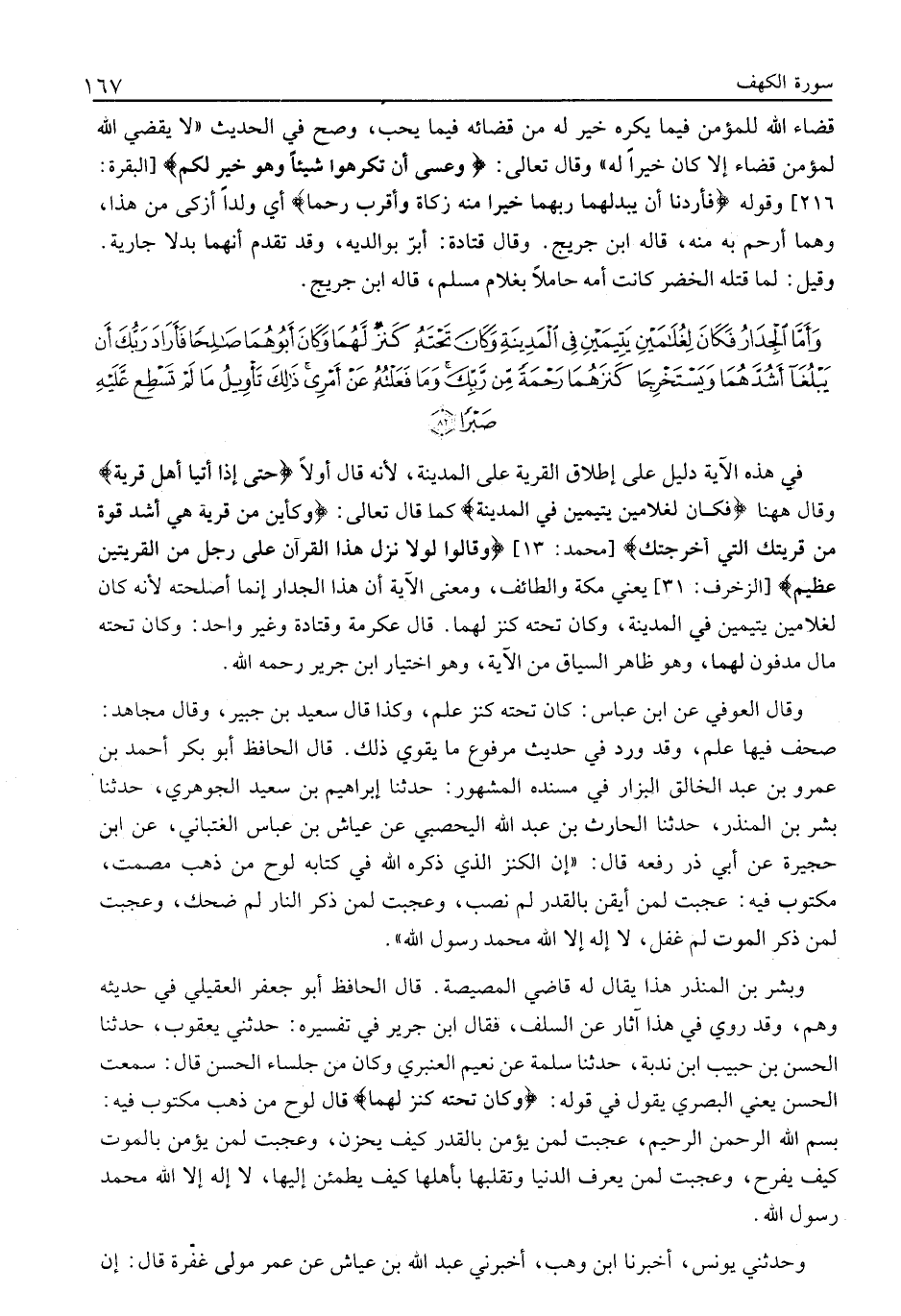 وبشر بْنُ الْمُنْذِرِ هَذَا يُقَالُ لَهُ قَاضِي الْمِصِّيصَةِ. قَالَ الْحَافِظُ أَبُو جَعْفَرٍ الْعُقَيْلِيُّ فِي حَدِيثِهِ وَهْمٌ، وَقَدْ رُوِيَ فِي هَذَا آثَارٌ عَنِ السَّلَفِ، فَقَالَ ابْنُ جَرِيرٍ فِي تَفْسِيرِهِ: حَدَّثَنِي يعقوب، حدثنا الحسن بن حبيب ابن نُدْبَةَ، حَدَّثَنَا سَلَمَةُ عَنْ نُعَيْمٍ الْعَنْبَرِيِّ وَكَانَ مِنْ جُلَسَاءِ الْحَسَنِ قَالَ: سَمِعْتُ الْحَسَنَ يَعْنِي الْبَصْرِيَّ يَقُولُ فِي قَوْلِهِ: وَكانَ تَحْتَهُ كَنْزٌ لَهُما قَالَ لَوْحٌ مِنْ ذَهَبٍ مَكْتُوبٍ فِيهِ: