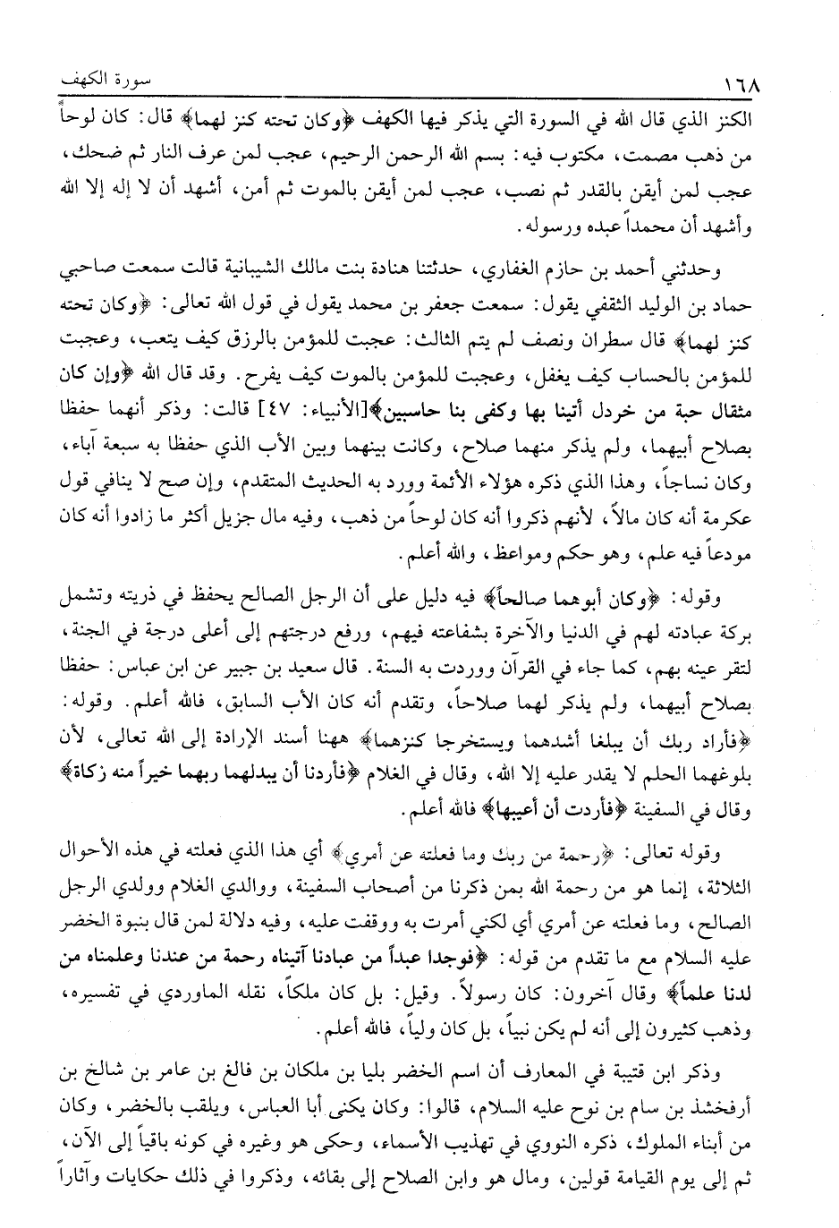 وَحَدَّثَنِي أحمد بن حازم الغفاري، حدثتنا هَنَّادَةُ بِنْتُ مَالِكٍ الْشَيْبَانِيَّةُ قَالَتْ سَمِعَتْ صَاحِبِي حَمَّادَ بْنَ الْوَلِيدِ الثَّقَفِيَّ يَقُولُ: سَمِعْتُ جَعْفَرَ بْنَ مُحَمَّدٍ يَقُولُ فِي قَوْلِ اللَّهِ تَعَالَى: وَكانَ تَحْتَهُ كَنْزٌ لَهُما قَالَ سَطْرَانِ وَنِصْفٌ لم يتم الثالث: عجبت للمؤمن بالرزق كيف يتعب، وعجبت للمؤمن بالحساب كيف يغفل، وعجبت للمؤمن بالموت كيف يفرح. وقد قال الله وَإِنْ كانَ مِثْقالَ حَبَّةٍ مِنْ خَرْدَلٍ أَتَيْنا بِها وَكَفى بِنا حاسِبِينَ [الْأَنْبِيَاءِ: 47] قَالَتْ: وَذُكِرَ أَنَّهُمَا حُفِظَا بِصَلَاحِ أَبِيهِمَا، وَلَمْ يُذْكَرْ مِنْهُمَا صلاح، وكانت بَيْنَهُمَا وَبَيْنَ الْأَبِ الَّذِي حُفِظَا بِهِ سَبْعَةُ آبَاءٍ، وَكَانَ نَسَّاجًا، وَهَذَا الَّذِي ذَكَرَهُ هَؤُلَاءِ الْأَئِمَّةُ وَوَرَدَ بِهِ الْحَدِيثُ الْمُتَقَدِّمُ، وَإِنْ صَحَّ لَا يُنَافِي قَوْلَ عِكْرِمَةَ أَنَّهُ كَانَ مَالًا، لِأَنَّهُمْ ذَكَرُوا أَنَّهُ كَانَ لَوْحًا مِنْ ذَهَبٍ، وَفِيهِ مَالٌ جَزِيلٌ أَكْثَرُ مَا زَادُوا أَنَّهُ كَانَ مُودَعًا فِيهِ عِلْمٌ، وَهُوَ حِكَمٌ وَمَوَاعِظُ، وَاللَّهُ أَعْلَمُ.