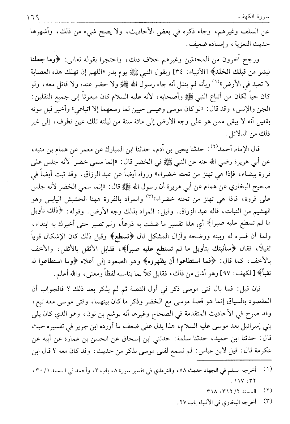قَالَ الْإِمَامُ أَحْمَدُ «2» : حَدَّثَنَا يَحْيَى بْنُ آدَمَ، حَدَّثَنَا ابْنِ الْمُبَارَكِ عَنْ مَعْمَرٍ عَنْ هَمَّامِ بْنِ مُنَبِّهٍ، عَنْ أَبِي هُرَيْرَةَ رَضِيَ اللَّهُ عَنْهُ عَنِ النَّبِيِّ صَلَّى اللَّهُ عَلَيْهِ وَسَلَّمَ فِي الْخَضِرِ قَالَ: «إِنَّمَا سُمِّيَ خَضِرًا لِأَنَّهُ جلس على فروة بيضاء، فإذا هي تهتز من تحته خَضْرَاءَ» وَرَوَاهُ أَيْضًا عَنْ عَبْدِ الرَّزَّاقِ، وَقَدْ ثَبَتَ أَيْضًا فِي صَحِيحِ الْبُخَارِيِّ عَنْ هَمَّامٍ عَنْ أَبِي هُرَيْرَةَ أَنَّ رَسُولَ اللَّهِ صَلَّى اللَّهُ عَلَيْهِ وَسَلَّمَ قَالَ: «إِنَّمَا سُمِّي الْخَضِرُ لِأَنَّهُ جَلَسَ عَلَى فَرْوَةٍ، فَإِذَا هِيَ تَهْتَزُّ من تحته خَضْرَاءَ» «3» وَالْمُرَادُ بِالْفَرْوَةِ هَاهُنَا الْحَشِيشُ الْيَابِسُ وَهُوَ الْهَشِيمُ مِنَ النَّبَاتِ، قَالَهُ عَبْدُ الرَّزَّاقِ؟؟؟. وَقِيلَ: الْمُرَادُ بِذَلِكَ وَجْهُ الْأَرْضِ. وَقَوْلُهُ: ذلِكَ تَأْوِيلُ مَا لَمْ تَسْطِعْ عَلَيْهِ صَبْراً أَيْ هَذَا تَفْسِيرُ مَا ضِقْتَ بِهِ ذَرْعًا، وَلَمْ تَصْبِرْ حَتَّى أُخْبِرَكَ بِهِ ابْتِدَاءً، وَلَمَّا أَنْ فَسَّرَهُ له وبينه ووضحه وأزال المشكل قال تَسْطِعْ وَقَبْلَ ذَلِكَ كَانَ الْإِشْكَالُ قَوِيًّا ثَقِيلًا، فَقَالَ سَأُنَبِّئُكَ بِتَأْوِيلِ مَا لَمْ تَسْتَطِعْ عَلَيْهِ صَبْراً، فَقَابَلَ الْأَثْقَلَ بِالْأَثْقَلِ، وَالْأَخَفَّ بِالْأَخَفِّ، كَمَا قال: فَمَا اسْطاعُوا أَنْ يَظْهَرُوهُ وَهُوَ الصُّعُودُ إِلَى أَعْلَاهُ وَمَا اسْتَطاعُوا لَهُ نَقْباً [الْكَهْفِ: 97] وَهُوَ أَشَقُّ مِنْ ذَلِكَ، فَقَابَلَ كُلًّا بِمَا يُنَاسِبُهُ لَفْظًا وَمَعْنَى، وَاللَّه أَعْلَمُ.
