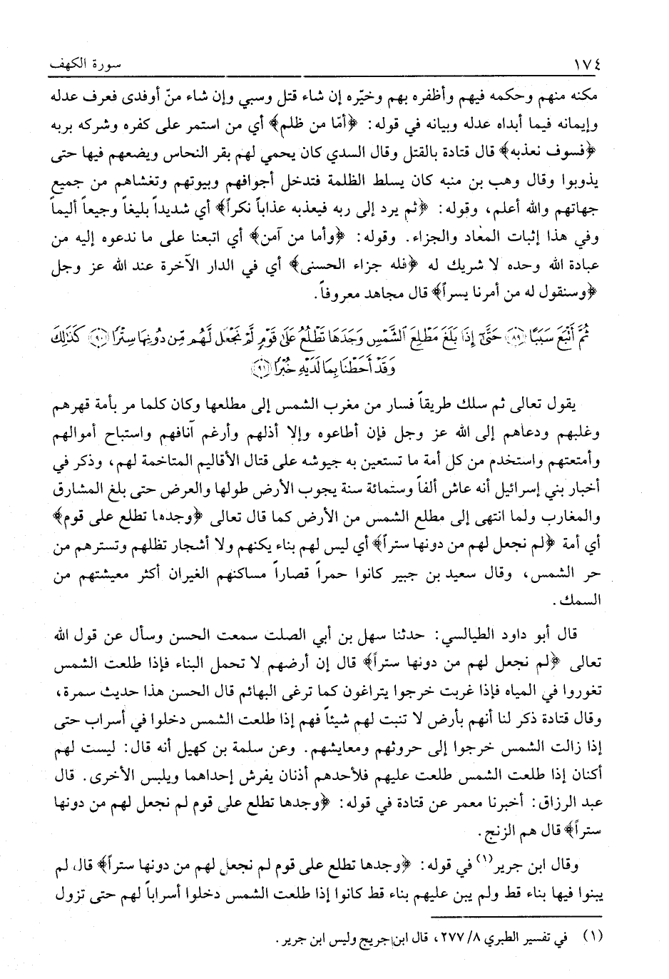 وقال ابن جرير «1» فِي قَوْلِهِ: وَجَدَها تَطْلُعُ عَلى قَوْمٍ لَمْ نَجْعَلْ لَهُمْ مِنْ دُونِها سِتْراً قَالَ لَمْ يَبْنُوا فِيهَا بِنَاءً قَطُّ وَلَمْ يُبْنَ عَلَيْهِمْ بِنَاءٌ قَطُّ كَانُوا إِذَا طَلَعَتِ الشَّمْسُ دَخَلُوا أسرابا لهم حتى تزول