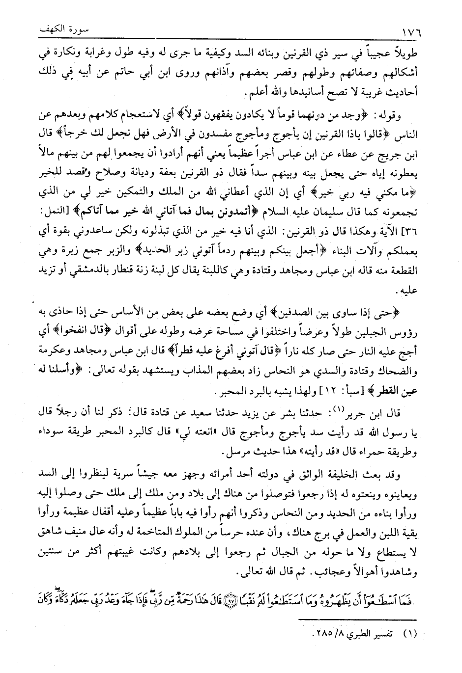 طَوِيلًا عَجِيبًا فِي سَيْرِ ذِي الْقَرْنَيْنِ وَبِنَائِهِ السَّدَّ وَكَيْفِيَّةِ مَا جَرَى لَهُ وَفِيهِ طُولٌ وَغَرَابَةٌ وَنَكَارَةٌ فِي أَشْكَالِهِمْ وَصِفَاتِهِمْ وَطُولِهِمْ وَقِصَرِ بعضهم وآذانهم وروى ابن أبي حاتم عن أبيه في ذلك أحاديث غريبة لَا تَصِحُّ أَسَانِيدُهَا وَاللَّهُ أَعْلَمُ.