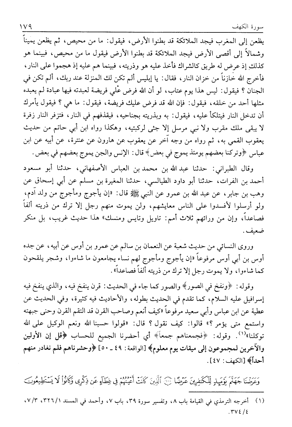 (1) أخرجه الترمذي في القيامة باب 8، وتفسير سورة 39، باب 7، وأحمد في المسند 1/ 326، 3/ 7، 4/ 374. [.....]