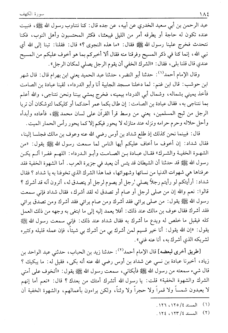 قَالَ: فَبَيْنَمَا نَحْنُ كَذَلِكَ إِذْ طَلَعَ شَدَّادُ بْنُ أَوْسٍ رَضِيَ اللَّهُ عَنْهُ وَعَوْفُ بْنُ مَالِكٍ فَجَلَسَا إِلَيْنَا، فَقَالَ شَدَّادٌ: إِنَّ أَخْوَفَ مَا أَخَافُ عَلَيْكُمْ أَيُّهَا النَّاسُ لَمَا سَمِعْتُ رَسُولَ اللَّهِ صَلَّى اللَّهُ عَلَيْهِ وَسَلَّمَ يَقُولُ: «مِنَ الشَّهْوَةِ الْخَفِيَّةِ وَالشِّرْكِ» فَقَالَ عُبَادَةُ بْنُ الصَّامِتِ وَأَبُو الدَّرْدَاءِ: اللهم غفرا ألم يَكُنْ رَسُولُ اللَّهِ صَلَّى اللَّهُ عَلَيْهِ وَسَلَّمَ قَدْ حَدَّثَنَا أَنَّ الشَّيْطَانَ قَدْ يَئِسَ أَنْ يعبد في جزيرة العرب. أما الشَّهْوَةُ الْخَفِيَّةُ فَقَدْ عَرَفْنَاهَا هِيَ شَهَوَاتُ الدُّنْيَا مِنْ نِسَائِهَا وَشَهَوَاتِهَا، فَمَا هَذَا الشِّرْكُ الَّذِي تُخَوِّفُنَا بِهِ يَا شَدَّادُ؟ فَقَالَ شَدَّادٌ: أَرَأَيْتُكُمْ لو رأيتم رجلا يصلي رجل أو يصوم لرجل أو يتصدق لَهُ، أَتَرَوْنَ أَنَّهُ قَدْ أَشْرَكَ؟