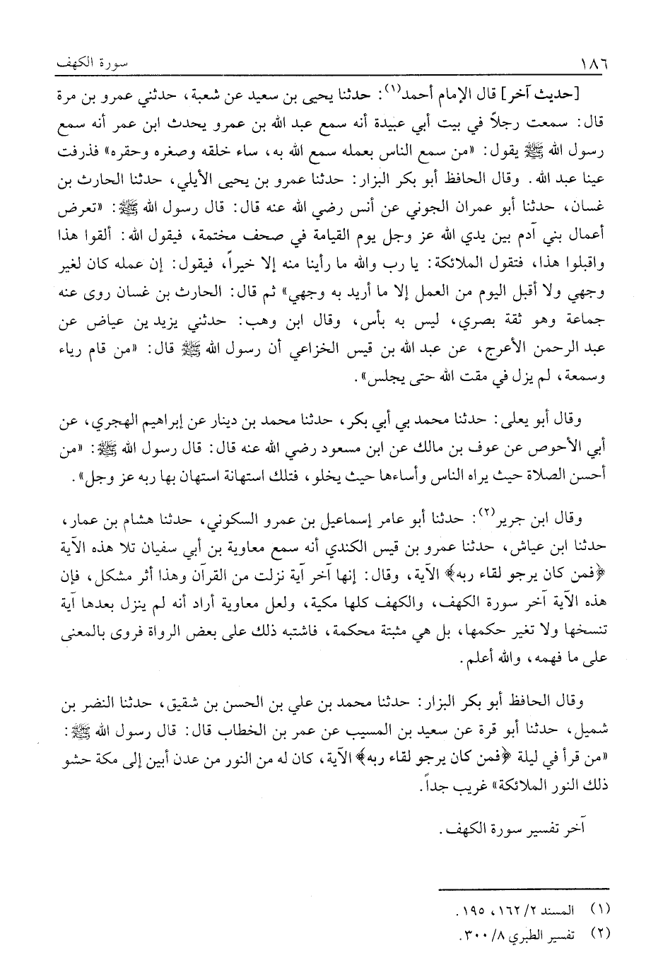 «مَنْ قَرَأَ فِي لَيْلَةٍ فَمَنْ كانَ يَرْجُوا لِقاءَ رَبِّهِ الآية، كان له من النور من عدن أبين إلى مكة حشو ذلك النور الْمَلَائِكَةُ» غَرِيبٌ جِدًّا.