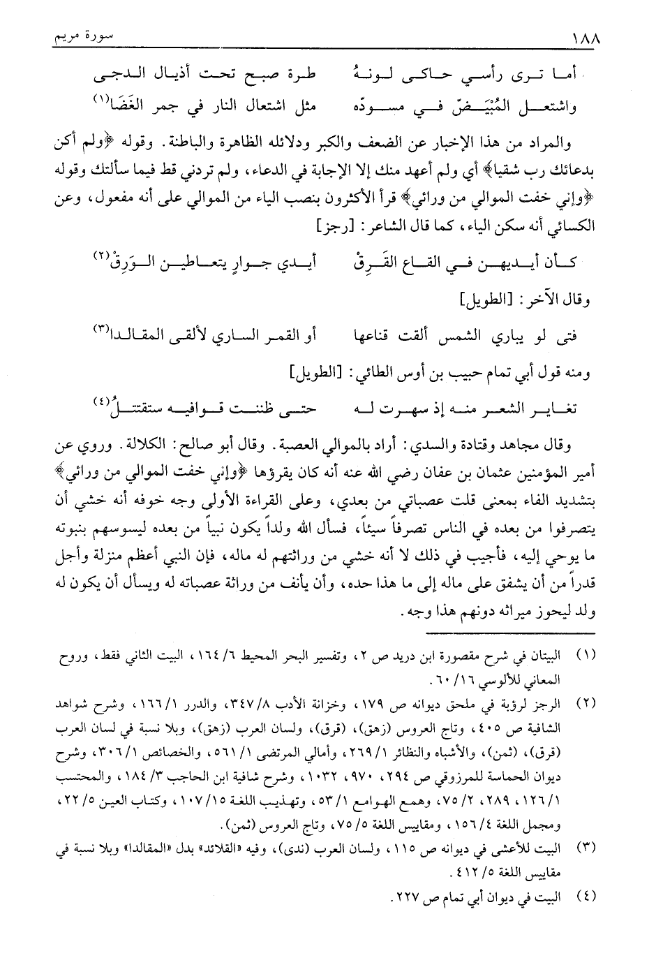 وَالْمُرَادُ مِنْ هَذَا الْإِخْبَارُ عَنِ الضَّعْفِ وَالْكِبَرِ وَدَلَائِلِهِ الظَّاهِرَةِ وَالْبَاطِنَةِ. وَقَوْلُهُ وَلَمْ أَكُنْ بِدُعائِكَ رَبِّ شَقِيًّا أَيْ وَلَمْ أَعْهَدْ مِنْكَ إِلَّا الْإِجَابَةَ فِي الدُّعَاءِ، وَلَمْ تَرُدَّنِي قَطُّ فِيمَا سَأَلْتُكَ وَقَوْلُهُ وَإِنِّي خِفْتُ الْمَوالِيَ مِنْ وَرائِي قَرَأَ الْأَكْثَرُونَ بِنَصْبِ الْيَاءِ مِنَ الْمَوَالِيَ عَلَى أَنَّهُ مَفْعُولٌ، وَعَنِ الْكِسَائِيِّ أَنَّهُ سَكَّنَ الْيَاءَ، كَمَا قال الشاعر: [رجز]