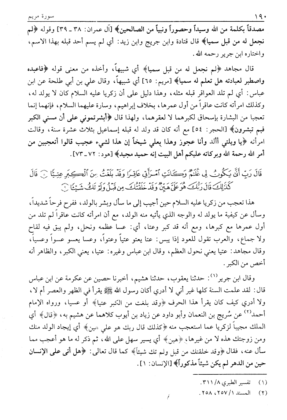 وَقَالَ ابْنُ جَرِيرٍ «1» : حَدَّثَنَا يَعْقُوبُ، حَدَّثَنَا هُشَيْمٌ، أَخْبَرَنَا حُصَيْنٌ عَنْ عِكْرِمَةَ عَنِ ابْنِ عَبَّاسٍ قَالَ: لَقَدْ عَلِمْتُ السُّنَّةَ كُلَّهَا غَيْرَ أَنِّي لَا أَدْرِي أَكَانَ رَسُولَ اللَّهِ صَلَّى اللَّهُ عَلَيْهِ وَسَلَّمَ يَقْرَأُ فِي الظُّهْرِ وَالْعَصْرِ أَمْ لَا، وَلَا أَدْرِي كَيْفَ كَانَ يَقْرَأُ هَذَا الْحَرْفَ وَقَدْ بَلَغْتُ مِنَ الْكِبَرِ عِتِيًّا أَوْ عِسِيًّا، وَرَوَاهُ الْإِمَامُ أَحْمَدُ «2» عَنْ سُرَيْجِ بْنِ النُّعْمَانِ وَأَبُو دَاوُدَ عَنْ زِيَادِ بْنِ أَيُّوبَ كِلَاهُمَا عَنْ هُشَيْمٍ بِهِ، قالَ أَيِ الْمَلَكُ مُجِيبًا لِزَكَرِيَّا عَمَّا اسْتَعْجَبَ مِنْهُ كَذلِكَ قالَ رَبُّكَ هُوَ عَلَيَّ هَيِّنٌ أَيْ إِيجَادُ الْوَلَدِ مِنْكَ وَمَنْ زَوْجَتِكَ هَذِهِ لَا مِنْ غَيْرِهَا، هَيِّنٌ أَيْ يَسِيرٌ سَهْلٌ عَلَى اللَّهِ، ثُمَّ ذَكَرَ لَهُ مَا هُوَ أَعْجَبُ مِمَّا سَأَلَ عَنْهُ، فَقَالَ وَقَدْ خَلَقْتُكَ مِنْ قَبْلُ وَلَمْ تَكُ شَيْئاً كَمَا قَالَ تَعَالَى: هَلْ أَتى عَلَى الْإِنْسانِ حِينٌ مِنَ الدَّهْرِ لَمْ يَكُنْ شَيْئاً مَذْكُوراً [الإنسان: 1] .