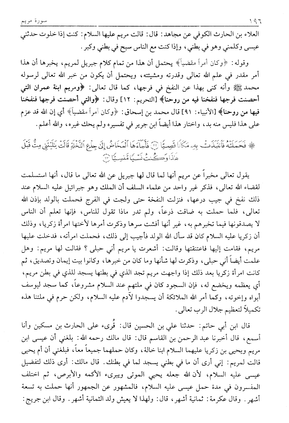 قَالَ ابْنُ أَبِي حَاتِمٍ: حَدَّثَنَا عَلِيُّ بْنُ الْحُسَيْنِ قَالَ: قُرِئَ عَلَى الْحَارِثِ بْنِ مِسْكِينٍ وَأَنَا أَسْمَعُ، قَالَ أَخْبَرَنَا عَبْدُ الرَّحْمَنِ بْنُ الْقَاسِمِ قَالَ: قَالَ مَالِكٌ رَحِمَهُ اللَّهُ: بَلَغَنِي أَنَّ عيسى ابن مريم ويحيى بن زكريا عليهما السلام ابْنَا خَالَةٍ، وَكَانَ حَمْلُهُمَا جَمِيعًا مَعًا، فَبَلَغَنِي أَنَّ أُمَّ يَحْيَى قَالَتْ لِمَرْيَمَ: إِنِّي أَرَى أَنَّ مَا فِي بَطْنِي يَسْجُدُ لِمَا فِي بَطْنِكِ. قَالَ مَالِكٌ: أَرَى ذَلِكَ لِتَفْضِيلِ عِيسَى عَلَيْهِ السَّلَامُ، لِأَنَّ اللَّهَ جَعَلَهُ يُحْيِي الْمَوْتَى وَيُبْرِئُ الْأَكْمَهَ وَالْأَبْرَصَ، ثُمَّ اخْتَلَفَ الْمُفَسِّرُونَ فِي مُدَّةِ حَمْلِ عِيسَى عَلَيْهِ السَّلَامُ، فَالْمَشْهُورُ عَنِ الْجُمْهُورِ أَنَّهَا حَمَلَتْ بِهِ تِسْعَةَ أَشْهُرٍ. وَقَالَ عِكْرِمَةُ: ثَمَانِيَةُ أَشْهُرٍ، قَالَ: وَلِهَذَا لَا يَعِيشُ ولد الثمانية أَشْهُرٍ. وَقَالَ ابْنُ جُرَيْجٍ: