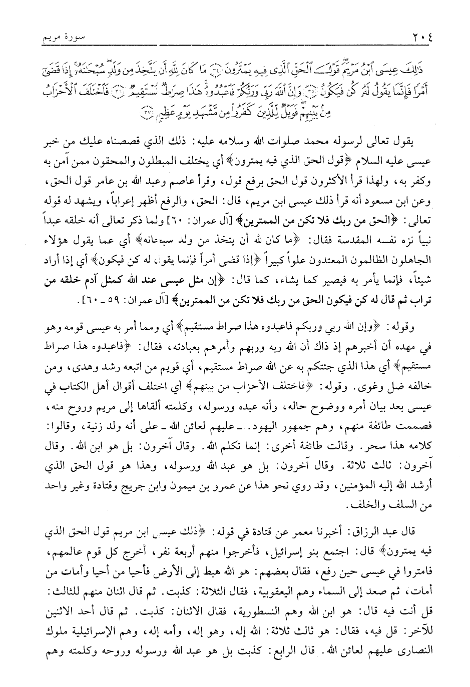 قَالَ عَبْدُ الرَّزَّاقِ: أَخْبَرَنَا مَعْمَرٌ عَنْ قَتَادَةَ فِي قَوْلِهِ: ذلِكَ عِيسَى ابْنُ مَرْيَمَ قَوْلَ الْحَقِّ الَّذِي فِيهِ يَمْتَرُونَ قَالَ: اجْتَمَعَ بَنُو إِسْرَائِيلَ، فَأَخْرَجُوا مِنْهُمْ أَرْبَعَةَ نَفَرٍ، أَخْرَجَ كُلُّ قَوْمٍ عَالِمَهُمْ، فَامْتَرُوا في عيسى حين رفع، فقال بعضهم: هُوَ اللَّهُ هَبَطَ إِلَى الْأَرْضِ فَأَحْيَا مَنْ أَحْيَا وَأَمَاتَ مَنْ أَمَاتَ، ثُمَّ صَعِدَ إِلَى السَّمَاءِ وَهُمُ الْيَعْقُوبِيَّةُ، فَقَالَ الثَّلَاثَةُ: كَذَبْتَ. ثُمَّ قَالَ اثْنَانِ مِنْهُمْ لِلثَّالِثِ: