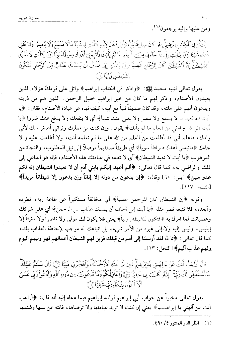 أَيْ لَا يَنْفَعُكَ وَلَا يَدْفَعُ عَنْكَ ضَرَرًا يَا أَبَتِ إِنِّي قَدْ جاءَنِي مِنَ الْعِلْمِ مَا لَمْ يَأْتِكَ يَقُولُ: وإن كنت من صلبك وتراني أَصْغَرُ مِنْكَ لِأَنِّي وَلَدُكَ، فَاعْلَمْ أَنِّي قَدِ اطَّلَعْتُ مِنَ الْعِلْمِ مِنَ اللَّهِ عَلَى مَا لَمْ تَعْلَمْهُ أَنْتَ، وَلَا اطَّلَعْتَ عَلَيْهِ وَلَا جاءك فَاتَّبِعْنِي أَهْدِكَ صِراطاً سَوِيًّا أَيْ طَرِيقًا مُسْتَقِيمًا مُوَصِّلًا إِلَى نَيْلِ الْمَطْلُوبِ، وَالنَّجَاةِ مِنَ الْمَرْهُوبِ يَا أَبَتِ لَا تَعْبُدِ الشَّيْطانَ أَيْ لَا تُطِعْهُ فِي عِبَادَتِكَ هَذِهِ الْأَصْنَامَ، فَإِنَّهُ هُوَ الدَّاعِي إِلَى ذَلِكَ وَالرَّاضِي بِهِ، كَمَا قَالَ تَعَالَى: أَلَمْ أَعْهَدْ إِلَيْكُمْ يَا بَنِي آدَمَ أَنْ لَا تَعْبُدُوا الشَّيْطانَ إِنَّهُ لَكُمْ عَدُوٌّ مُبِينٌ [يس: 60] وَقَالَ: إِنْ يَدْعُونَ مِنْ دُونِهِ إِلَّا إِناثاً وَإِنْ يَدْعُونَ إِلَّا شَيْطاناً مَرِيداً [النِّسَاءِ: 117] .