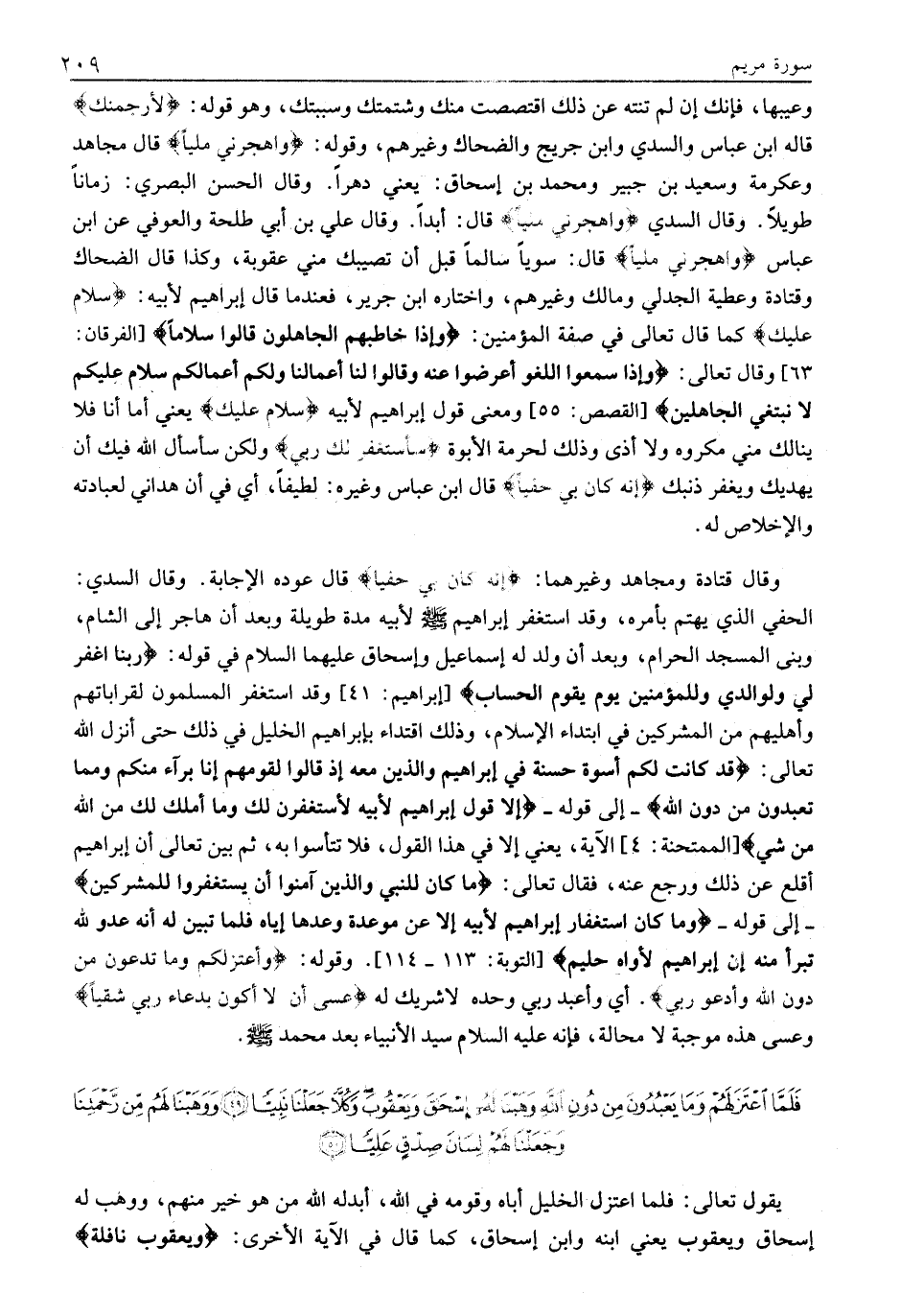 وَعَيْبِهَا، فَإِنَّكَ إِنْ لَمْ تَنْتَهِ عَنْ ذَلِكَ اقْتَصَصْتُ مِنْكَ وَشَتَمْتُكَ وَسَبَبْتُكَ، وَهُوَ قَوْلُهُ: لَأَرْجُمَنَّكَ قَالَهُ ابْنُ عَبَّاسٍ وَالسُّدِّيُّ وَابْنُ جُرَيْجٍ وَالضَّحَّاكُ وَغَيْرُهُمْ، وَقَوْلُهُ: وَاهْجُرْنِي مَلِيًّا قَالَ مُجَاهِدٌ وَعِكْرِمَةُ وَسَعِيدُ بْنُ جُبَيْرٍ وَمُحَمَّدُ بْنُ إِسْحَاقَ: يَعْنِي دَهْرًا. وَقَالَ الْحَسَنُ الْبَصْرِيُّ: زَمَانًا طَوِيلًا. وَقَالَ السُّدِّيُّ وَاهْجُرْنِي مَلِيًّا قَالَ: أَبَدًا. وَقَالَ عَلِيُّ بْنُ أَبِي طَلْحَةَ وَالْعَوْفِيُّ عَنِ ابْنِ عباس وَاهْجُرْنِي مَلِيًّا قَالَ: سَوِيًّا سَالِمًا قَبْلَ أَنْ تُصِيبَكَ مِنِّي عُقُوبَةٌ، وَكَذَا قَالَ الضَّحَّاكُ وقَتَادَةُ وعطية الجدلي ومالك وغيرهم، واختاره ابن جرير، فعند ما قَالَ إِبْرَاهِيمُ لِأَبِيهِ: سَلامٌ عَلَيْكَ كَمَا قَالَ تَعَالَى فِي صِفَةِ الْمُؤْمِنِينَ: وَإِذا خاطَبَهُمُ الْجاهِلُونَ قالُوا سَلاماً [الْفَرْقَانِ: