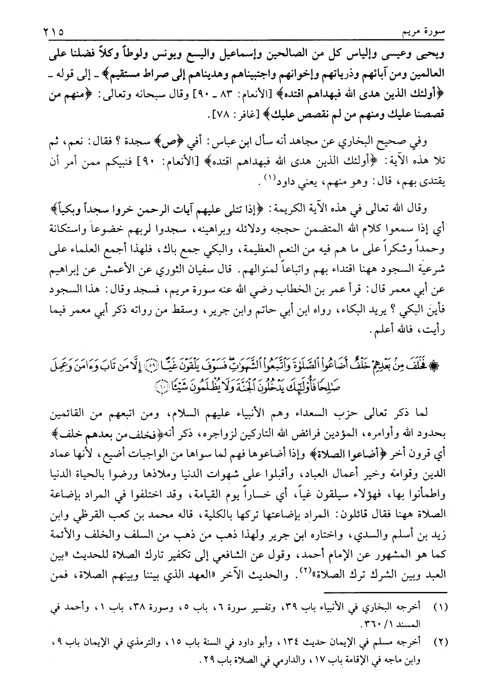 وَقَالَ اللَّهُ تَعَالَى فِي هَذِهِ الْآيَةِ الْكَرِيمَةِ: إِذا تُتْلى عَلَيْهِمْ آياتُ الرَّحْمنِ خَرُّوا سُجَّداً وَبُكِيًّا أَيْ إِذَا سَمِعُوا كَلَامَ اللَّهِ الْمُتَضَمِّنَ حُجَجَهُ وَدَلَائِلَهُ وَبَرَاهِينَهُ، سَجَدُوا لِرَبِّهِمْ خُضُوعًا وَاسْتِكَانَةً وَحَمْدًا وَشُكْرًا عَلَى مَا هُمْ فِيهِ مِنَ النِّعَمِ الْعَظِيمَةِ، وَالْبُكِيُّ جَمْعُ بَاكٍ، فَلِهَذَا أَجْمَعَ الْعُلَمَاءُ عَلَى شَرْعِيَّةِ السُّجُودِ هَاهُنَا اقْتِدَاءً بِهِمْ وَاتِّبَاعًا لِمِنْوَالِهِمْ. قَالَ سُفْيَانُ الثَّوْرِيُّ عَنِ الْأَعْمَشِ عَنْ إِبْرَاهِيمَ عَنْ أَبِي مَعْمَرٍ قَالَ: قَرَأَ عُمَرُ بْنُ الْخَطَّابِ رَضِيَ اللَّهُ عَنْهُ سُورَةَ مَرْيَمَ، فَسَجَدَ وَقَالَ: هَذَا السُّجُودُ فَأَيْنَ الْبُكِيُّ؟ يُرِيدُ الْبُكَاءَ، رَوَاهُ ابْنُ أَبِي حاتم وابن جرير، وسقط من رواته ذكر أبي معمر فيما رأيت، فالله أعلم.