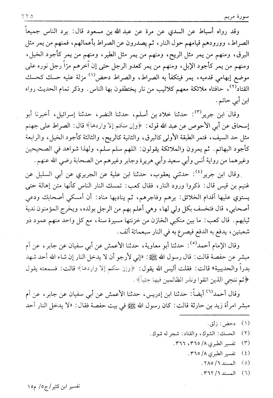 وَقَالَ ابْنُ جَرِيرٍ «3» : حَدَّثَنَا خَلَّادُ بْنُ أَسْلَمَ، حَدَّثَنَا النَّضْرُ، حَدَّثَنَا إِسْرَائِيلُ، أَخْبَرَنَا أَبُو إِسْحَاقَ عَنْ أَبِي الْأَحْوَصِ عَنْ عَبْدِ اللَّهِ قَوْلُهُ: وَإِنْ مِنْكُمْ إِلَّا وارِدُها قَالَ: الصِّرَاطُ عَلَى جَهَنَّمَ مِثْلُ حَدِّ السَّيْفِ، فَتَمُرُّ الطَّبَقَةُ الْأُولَى كَالْبَرْقِ، وَالثَّانِيَةُ كَالرِّيحِ، وَالثَّالِثَةُ كَأَجْوَدِ الْخَيْلِ، وَالرَّابِعَةُ كَأَجْوَدِ الْبَهَائِمِ. ثُمَّ يَمُرُّونَ وَالْمَلَائِكَةُ يَقُولُونَ: اللَّهُمَّ سَلِّمْ سَلِّمْ، وَلِهَذَا شَوَاهِدُ فِي الصَّحِيحَيْنِ وَغَيْرِهِمَا مِنْ رِوَايَةِ أَنَسٍ وَأَبِي سَعِيدٍ وَأَبِي هُرَيْرَةَ وَجَابِرٍ وَغَيْرِهِمْ مِنَ الصَّحَابَةِ رَضِيَ اللَّهُ عَنْهُمْ.