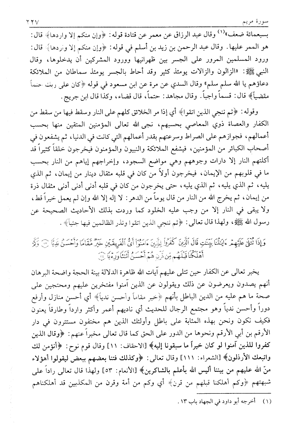 وُرُودُ الْمُسْلِمِينَ الْمُرُورُ على الجسر بين ظهرانيها وَوُرُودُ الْمُشْرِكِينَ أَنْ يَدْخُلُوهَا، وَقَالَ النَّبِيُّ صَلَّى اللَّهُ عَلَيْهِ وَسَلَّمَ: «الزَّالُّونَ وَالزَّالَّاتُ يَوْمَئِذٍ كَثِيرٌ وَقَدْ أَحَاطَ بِالْجِسْرِ يَوْمَئِذٍ سِمَاطَانِ مِنَ الْمَلَائِكَةِ دُعَاؤُهُمْ يَا أَللَّهُ سَلِّمْ سَلِّمْ» وَقَالَ السُّدِّيُّ عَنْ مُرَّةَ عَنِ ابْنِ مَسْعُودٍ فِي قَوْلِهِ كانَ عَلى رَبِّكَ حَتْماً مَقْضِيًّا قَالَ: قَسَمًا وَاجِبًا. وَقَالَ مُجَاهِدٌ: حَتْمًا، قَالَ قَضَاءً، وَكَذَا قَالَ ابْنُ جُرَيْجٍ.
