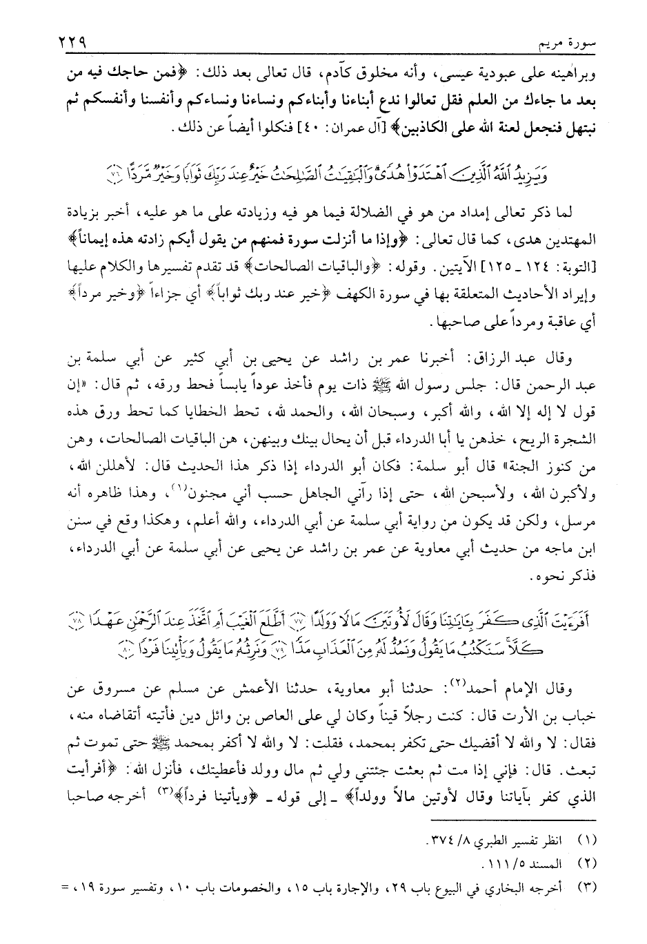 وَقَالَ الْإِمَامُ أَحْمَدُ «2» : حَدَّثَنَا أَبُو مُعَاوِيَةَ، حَدَّثَنَا الْأَعْمَشُ عَنْ مُسْلِمٍ عَنْ مَسْرُوقٍ عَنْ خَبَّابِ بْنِ الْأَرَتِّ قَالَ: كُنْتُ رَجُلًا قَيْنًا وَكَانَ لِي عَلَى الْعَاصِ بْنِ وَائِلٍ دَيْنٌ فأتيته أتقاضاه منه، فَقَالَ: لَا وَاللَّهِ لَا أَقْضِيكَ حَتَّى تَكْفُرَ بِمُحَمَّدٍ، فَقُلْتُ: لَا وَاللَّهِ لَا أَكْفُرُ بِمُحَمَّدٍ صَلَّى اللَّهُ عَلَيْهِ وَسَلَّمَ حَتَّى تَمُوتَ ثُمَّ تُبْعَثَ. قَالَ: فَإِنِّي إِذَا مُتُّ ثُمَّ بُعِثْتُ جِئْتَنِي وَلِي ثَمَّ مَالٌ وَوَلَدٌ فَأَعْطَيْتُكَ، فَأَنْزَلَ اللَّهُ: أَفَرَأَيْتَ الَّذِي كَفَرَ بِآياتِنا وَقالَ لَأُوتَيَنَّ مَالًا وَوَلَداً- إِلَى قَوْلِهِ- وَيَأْتِينا فَرْداً «3» أَخْرَجَهُ صاحبا