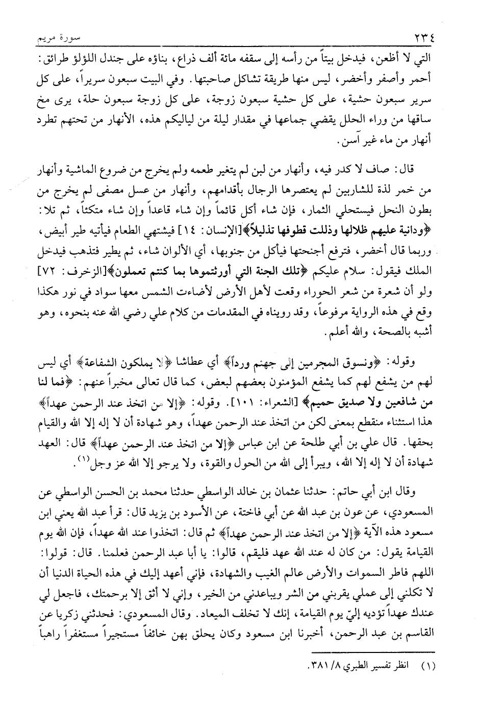 وَقَوْلُهُ: وَنَسُوقُ الْمُجْرِمِينَ إِلى جَهَنَّمَ وِرْداً أَيْ عِطَاشًا لَا يَمْلِكُونَ الشَّفاعَةَ أَيْ لَيْسَ لَهُمْ مَنْ يَشْفَعُ لَهُمْ كَمَا يَشْفَعُ الْمُؤْمِنُونَ بَعْضُهُمْ لِبَعْضٍ، كَمَا قَالَ تَعَالَى مُخْبِرًا عَنْهُمْ: فَما لَنا مِنْ شافِعِينَ وَلا صَدِيقٍ حَمِيمٍ [الشُّعَرَاءِ: 101] . وَقَوْلُهُ: إِلَّا مَنِ اتَّخَذَ عِنْدَ الرَّحْمنِ عَهْداً هَذَا اسْتِثْنَاءٌ مُنْقَطِعٌ بِمَعْنَى لَكِنْ مَنِ اتَّخَذَ عِنْدَ الرَّحْمَنِ عَهْدًا، وَهُوَ شَهَادَةُ أَنْ لَا إِلَهَ إِلَّا اللَّهُ وَالْقِيَامُ بِحَقِّهَا. قَالَ عَلِيُّ بْنُ أَبِي طَلْحَةَ عَنِ ابْنِ عَبَّاسٍ إِلَّا مَنِ اتَّخَذَ عِنْدَ الرَّحْمنِ عَهْداً قَالَ: الْعَهْدُ شَهَادَةُ أَنْ لَا إِلَهَ إِلَّا اللَّهُ، وَيَبْرَأُ إِلَى اللَّهِ مِنَ الْحَوْلِ وَالْقُوَّةِ، وَلَا يَرْجُو إِلَّا اللَّهِ عَزَّ وَجَلَّ «1» .