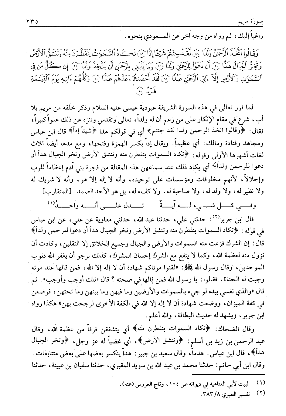 وَقالُوا اتَّخَذَ الرَّحْمنُ وَلَداً (88) لَقَدْ جِئْتُمْ شَيْئاً إِدًّا (89) تَكادُ السَّماواتُ يَتَفَطَّرْنَ مِنْهُ وَتَنْشَقُّ الْأَرْضُ وَتَخِرُّ الْجِبالُ هَدًّا (90) أَنْ دَعَوْا لِلرَّحْمنِ وَلَداً (91) وَما يَنْبَغِي لِلرَّحْمنِ أَنْ يَتَّخِذَ وَلَداً (92)