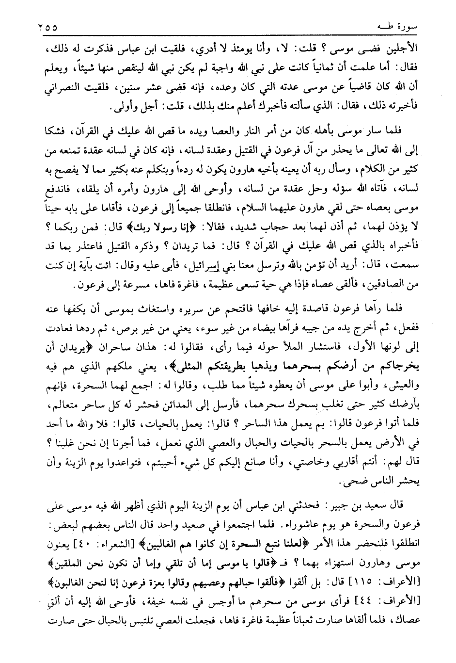 قَالَ سَعِيدُ بْنُ جُبَيْرٍ: فَحَدَّثَنِي ابْنُ عباس أن يوم الزينة اليوم الَّذِي أَظْهَرَ اللَّهُ فِيهِ مُوسَى عَلَى فِرْعَوْنَ وَالسَّحَرَةِ هُوَ يَوْمُ عَاشُورَاءَ. فَلَمَّا اجْتَمَعُوا فِي صَعِيدٍ وَاحِدٍ قَالَ النَّاسُ بَعْضُهُمْ لِبَعْضٍ: