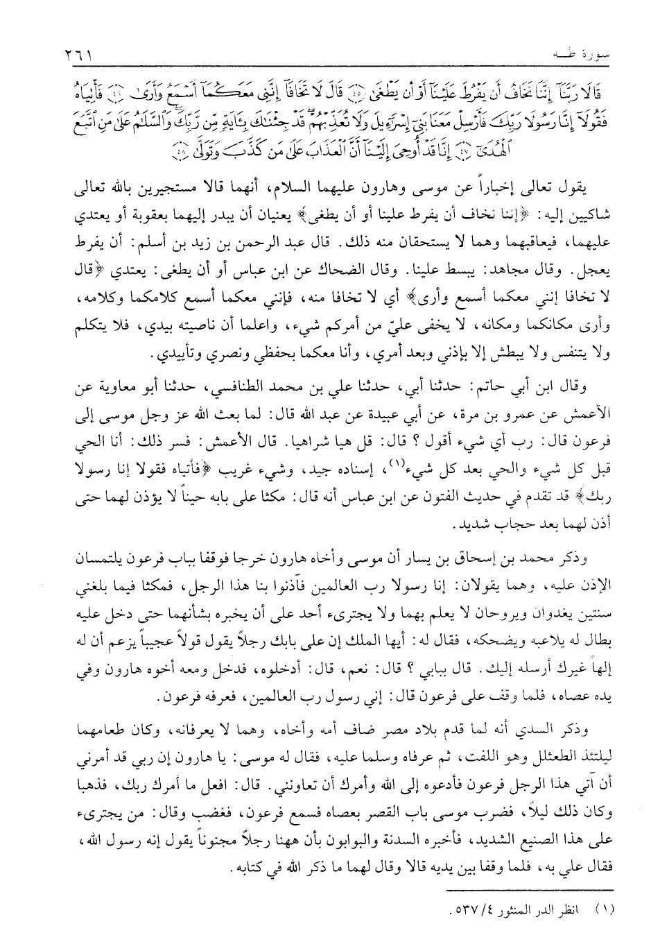 يَقُولُ تَعَالَى إِخْبَارًا عَنْ مُوسَى وَهَارُونَ عَلَيْهِمَا السَّلَامُ، أَنَّهُمَا قَالَا مُسْتَجِيرِينَ بِاللَّهِ تَعَالَى شَاكِيَيْنِ إِلَيْهِ: إِنَّنا نَخافُ أَنْ يَفْرُطَ عَلَيْنا أَوْ أَنْ يَطْغى يَعْنِيَانِ أَنْ يَبْدُرَ إِلَيْهِمَا بِعُقُوبَةٍ أَوْ يَعْتَدِيَ عَلَيْهِمَا، فَيُعَاقِبَهُمَا وَهُمَا لَا يَسْتَحِقَّانِ مِنْهُ ذلك. قَالَ عَبْدُ الرَّحْمَنِ بْنُ زَيْدِ بْنِ أَسْلَمَ: أَنْ يَفْرُطَ يَعْجَلَ. وَقَالَ مُجَاهِدٌ: يَبْسُطَ عَلَيْنَا. وَقَالَ الضَّحَّاكُ عَنِ ابْنِ عَبَّاسٍ أَوْ أَنْ يَطْغَى: يَعْتَدِيَ قالَ لَا تَخافا إِنَّنِي مَعَكُما أَسْمَعُ وَأَرى أَيْ لَا تَخَافَا مِنْهُ، فَإِنَّنِي مَعَكُمَا أَسْمَعُ كَلَامَكُمَا وَكَلَامَهُ، وَأَرَى مَكَانَكُمَا وَمَكَانَهُ، لَا يَخْفَى عَلَيَّ مِنْ أَمْرِكُمْ شَيْءٌ، وَاعْلَمَا أَنَّ نَاصِيَتَهُ بِيَدِي، فَلَا يَتَكَلَّمُ وَلَا يَتَنَفَّسُ وَلَا يَبْطِشُ إِلَّا بِإِذْنِي وَبَعْدَ أَمْرِي، وَأَنَا مَعَكُمَا بِحِفْظِي وَنَصْرِي وَتَأْيِيدِي.