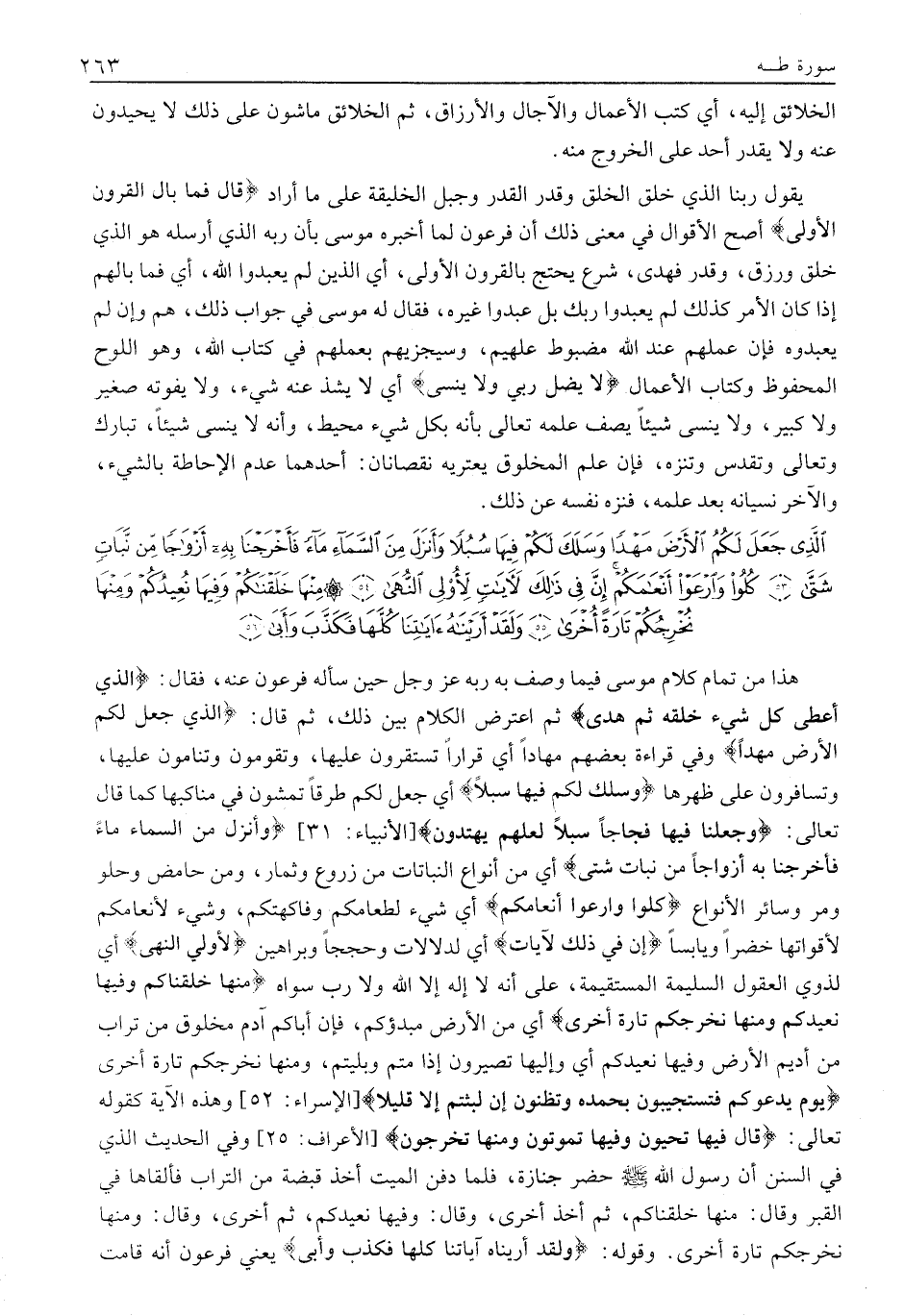 هَذَا مِنْ تَمَامِ كَلَامِ مُوسَى فِيمَا وَصَفَ بِهِ رَبَّهُ عَزَّ وَجَلَّ حِينَ سَأَلَهُ فِرْعَوْنُ عَنْهُ، فَقَالَ: الَّذِي أَعْطى كُلَّ شَيْءٍ خَلْقَهُ ثُمَّ هَدى ثُمَّ اعْتُرِضَ الْكَلَامُ بَيْنَ ذَلِكَ، ثُمَّ قَالَ: الَّذِي جَعَلَ لَكُمُ الْأَرْضَ مَهْداً وفي قراءة بعضهم مهادا أَيْ قَرَارًا تَسْتَقِرُّونَ عَلَيْهَا، وَتَقُومُونَ وَتَنَامُونَ عَلَيْهَا، وَتُسَافِرُونَ عَلَى ظَهْرِهَا وَسَلَكَ لَكُمْ فِيها سُبُلًا أَيْ جَعَلَ لَكُمْ طُرُقًا تَمْشُونَ فِي مَنَاكِبِهَا كَمَا قَالَ تَعَالَى: وَجَعَلْنا فِيها فِجاجاً سُبُلًا لَعَلَّهُمْ يَهْتَدُونَ [الْأَنْبِيَاءِ: 31] وَأَنْزَلَ مِنَ السَّماءِ مَاءً فَأَخْرَجْنا بِهِ أَزْواجاً مِنْ نَباتٍ شَتَّى أَيْ من أنواع النَّبَاتَاتِ مِنْ زُرُوعٍ وَثِمَارٍ، وَمِنْ حَامِضٍ وَحُلْوٍ ومر وَسَائِرِ الْأَنْوَاعِ كُلُوا وَارْعَوْا أَنْعامَكُمْ أَيْ شَيْءٌ لِطَعَامِكُمْ وَفَاكِهَتِكُمْ، وَشَيْءٌ لِأَنْعَامِكُمْ لِأَقْوَاتِهَا خَضِرًا وَيَابِسًا إِنَّ فِي ذلِكَ لَآياتٍ أَيْ لَدَلَالَاتٍ وَحُجَجًا وَبَرَاهِينَ لِأُولِي النُّهى أَيْ لِذَوِي الْعُقُولِ السَّلِيمَةِ الْمُسْتَقِيمَةِ، عَلَى أَنَّهُ لَا إِلَهَ إِلَّا اللَّهُ وَلَا رَبَّ سِوَاهُ مِنْها خَلَقْناكُمْ وَفِيها نُعِيدُكُمْ وَمِنْها نُخْرِجُكُمْ تارَةً أُخْرى أَيْ مِنَ الْأَرْضِ مَبْدَؤُكُمْ، فَإِنَّ أَبَاكُمْ آدَمَ مَخْلُوقٌ مِنْ تُرَابٍ مِنْ أَدِيمِ الْأَرْضِ وَفِيهَا نُعِيدُكُمْ أَيْ وَإِلَيْهَا تَصِيرُونَ إِذَا مُتُّمْ وَبَلِيتُمْ، وَمِنْهَا نُخْرِجُكُمْ تَارَةً أُخْرَى يَوْمَ يَدْعُوكُمْ فَتَسْتَجِيبُونَ بِحَمْدِهِ وَتَظُنُّونَ إِنْ لَبِثْتُمْ إِلَّا قَلِيلًا [الْإِسْرَاءِ: 52] وَهَذِهِ الْآيَةُ كَقَوْلِهِ تَعَالَى: قالَ فِيها تَحْيَوْنَ وَفِيها تَمُوتُونَ وَمِنْها تُخْرَجُونَ [الْأَعْرَافِ: 25] وَفِي الْحَدِيثِ الَّذِي فِي السُّنَنِ أَنَّ رَسُولَ اللَّهِ صَلَّى اللَّهُ عليه وسلم حَضَرَ جِنَازَةً، فَلَمَّا دُفِنَ الْمَيِّتُ أَخَذَ قَبْضَةً من التراب فألقاها في القبر وقال: مِنْهَا خَلَقْنَاكُمْ، ثُمَّ أَخَذَ أُخْرَى، وَقَالَ: وَفِيهَا نعيدكم، ثم أُخْرَى، وَقَالَ: وَمِنْهَا نُخْرِجُكُمْ تَارَةً أُخْرَى. وَقَوْلُهُ: وَلَقَدْ أَرَيْناهُ آياتِنا كُلَّها فَكَذَّبَ وَأَبى يَعْنِي فِرْعَوْنَ أَنَّهُ قَامَتْ