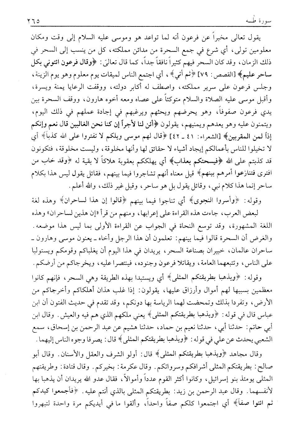 وَقَالَ مُجَاهِدٌ وَيَذْهَبا بِطَرِيقَتِكُمُ الْمُثْلى قال: أولو الشَّرَفِ وَالْعَقْلِ وَالْأَسْنَانِ. وَقَالَ أَبُو صَالِحٍ: بِطَرِيقَتِكُمُ الْمُثْلَى أَشْرَافُكُمْ وَسَرُوَاتُكُمْ. وَقَالَ عِكْرِمَةُ: بِخَيْرِكُمْ. وَقَالَ قتادة: وطريقتهم المثلى يومئذ بنو إسرائيل، وكانوا أَكْثَرَ الْقَوْمِ عَدَدًا وَأَمْوَالًا، فَقَالَ عَدُوُّ اللَّهِ يُرِيدَانِ أَنْ يَذْهَبَا بِهَا لِأَنْفُسِهِمَا. وَقَالَ عَبْدُ الرَّحْمَنِ بْنُ زَيْدٍ: بِطَرِيقَتِكُمُ الْمُثْلَى بِالَّذِي أَنْتُمْ عليه. فَأَجْمِعُوا كَيْدَكُمْ ثُمَّ ائْتُوا صَفًّا أَيِ اجْتَمِعُوا كُلُّكُمْ صَفًّا وَاحِدًا، وَأَلْقُوا مَا فِي أَيْدِيكُمْ مَرَّةً وَاحِدَةً لِتَبْهَرُوا
