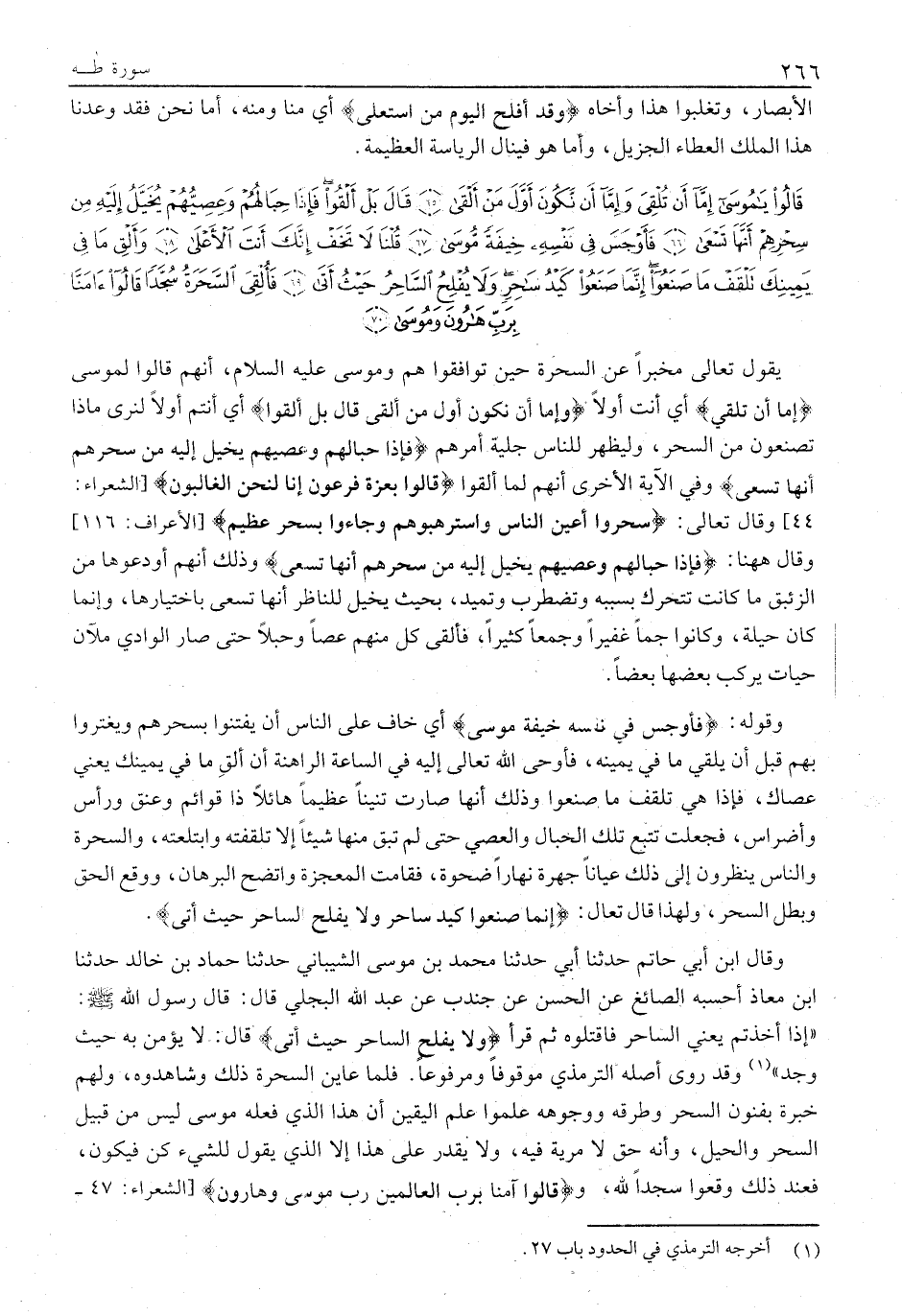 «إِذَا أَخَذْتُمْ يَعْنِي السَّاحِرَ فَاقْتُلُوهُ ثُمَّ قَرَأَ وَلا يُفْلِحُ السَّاحِرُ حَيْثُ أَتى قَالَ: لَا يُؤْمَنُ بِهِ حَيْثُ وُجِدَ» «1» وَقَدْ رَوَى أَصْلَهُ التِّرْمِذِيُّ مَوْقُوفًا وَمَرْفُوعًا. فَلَمَّا عَايَنَ السَّحَرَةُ ذَلِكَ وَشَاهَدُوهُ، وَلَهُمْ خِبْرَةٌ بِفُنُونِ السِّحْرِ وَطُرُقِهِ وَوُجُوهِهِ عَلِمُوا عِلْمَ الْيَقِينِ أَنَّ هَذَا الَّذِي فَعَلَهُ مُوسَى لَيْسَ مِنْ قَبِيلِ السِّحْرِ وَالْحِيَلِ، وَأَنَّهُ حَقٌّ لَا مِرْيَةَ فِيهِ، وَلَا يَقْدِرُ عَلَى هَذَا إِلَّا الَّذِي يَقُولُ لِلشَّيْءِ كُنْ فَيَكُونُ، فَعِنْدَ ذَلِكَ وَقَعُوا سُجَّدًا لِلَّهِ، وقالُوا آمَنَّا بِرَبِّ الْعالَمِينَ رَبِّ مُوسى وَهارُونَ [الشعراء: 47-