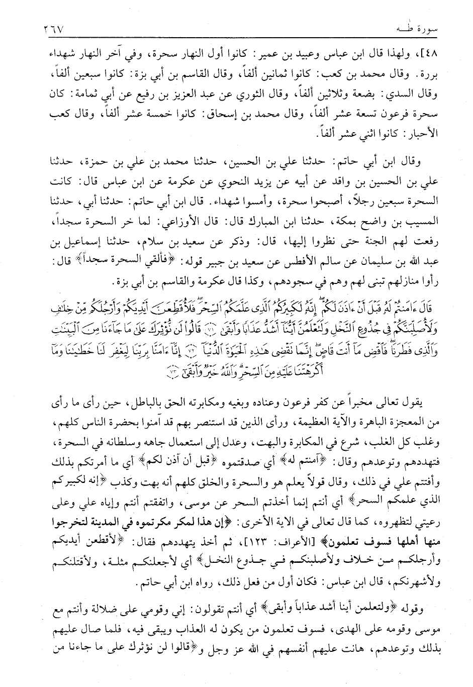 48] ، وَلِهَذَا قَالَ ابْنُ عَبَّاسٍ وَعُبَيْدُ بْنُ عُمَيْرٍ: كَانُوا أَوَّلَ النَّهَارِ سَحَرَةً، وَفِي آخِرِ النَّهَارِ شهداء بررة. وقال مُحَمَّدُ بْنُ كَعْبٍ: كَانُوا ثَمَانِينَ أَلْفًا، وَقَالَ الْقَاسِمُ بْنُ أَبِي بَزَّةَ: كَانُوا سَبْعِينَ أَلْفًا، وَقَالَ السُّدِّيُّ: بِضْعَةً وَثَلَاثِينَ أَلْفًا، وَقَالَ الثَّوْرِيُّ عَنْ عَبْدِ الْعَزِيزِ بْنِ رُفَيْعٍ عَنْ أَبِي ثُمَامَةَ: كَانَ سَحَرَةُ فِرْعَوْنَ تِسْعَةَ عَشَرَ أَلْفًا، وَقَالَ مُحَمَّدُ بْنُ إِسْحَاقَ: كَانُوا خَمْسَةَ عَشَرَ أَلْفًا، وَقَالَ كَعْبُ الْأَحْبَارِ: كَانُوا اثْنَيْ عَشَرَ أَلْفًا.