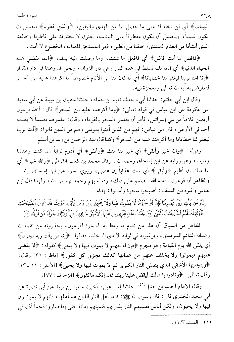 الظَّاهِرُ مِنَ السِّيَاقِ أَنَّ هَذَا مِنْ تَمَامِ مَا وَعَظَ بِهِ السَّحَرَةُ لِفِرْعَوْنَ، يُحَذِّرُونَهُ مِنْ نِقْمَةِ اللَّهِ وَعَذَابِهِ الدَّائِمِ السَّرْمَدِيِّ، وَيُرَغِّبُونَهُ فِي ثَوَابِهِ الْأَبَدِيِّ الْمُخَلَّدِ، فَقَالُوا: إِنَّهُ مَنْ يَأْتِ رَبَّهُ مُجْرِماً أَيْ يَلْقَى اللَّهَ يَوْمَ الْقِيَامَةِ وَهُوَ مُجْرِمٌ فَإِنَّ لَهُ جَهَنَّمَ لَا يَمُوتُ فِيها وَلا يَحْيى كَقَوْلِهِ: لَا يُقْضى عَلَيْهِمْ فَيَمُوتُوا وَلا يُخَفَّفُ عَنْهُمْ مِنْ عَذابِها كَذلِكَ نَجْزِي كُلَّ كَفُورٍ [فَاطِرٍ: 36] وَقَالَ: