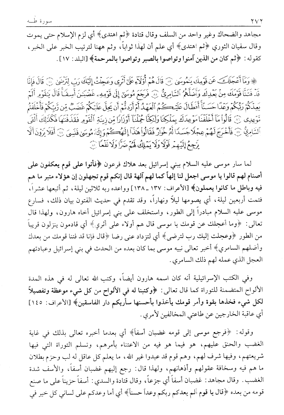 وَما أَعْجَلَكَ عَنْ قَوْمِكَ يَا مُوسى (83) قالَ هُمْ أُولاءِ عَلى أَثَرِي وَعَجِلْتُ إِلَيْكَ رَبِّ لِتَرْضى (84) قالَ فَإِنَّا قَدْ فَتَنَّا قَوْمَكَ مِنْ بَعْدِكَ وَأَضَلَّهُمُ السَّامِرِيُّ (85) فَرَجَعَ مُوسى إِلى قَوْمِهِ غَضْبانَ أَسِفاً قالَ يَا قَوْمِ أَلَمْ يَعِدْكُمْ رَبُّكُمْ وَعْداً حَسَناً أَفَطالَ عَلَيْكُمُ الْعَهْدُ أَمْ أَرَدْتُمْ أَنْ يَحِلَّ عَلَيْكُمْ غَضَبٌ مِنْ رَبِّكُمْ فَأَخْلَفْتُمْ مَوْعِدِي (86) قالُوا مَا أَخْلَفْنا مَوْعِدَكَ بِمَلْكِنا وَلكِنَّا حُمِّلْنا أَوْزاراً مِنْ زِينَةِ الْقَوْمِ فَقَذَفْناها فَكَذلِكَ أَلْقَى السَّامِرِيُّ (87)