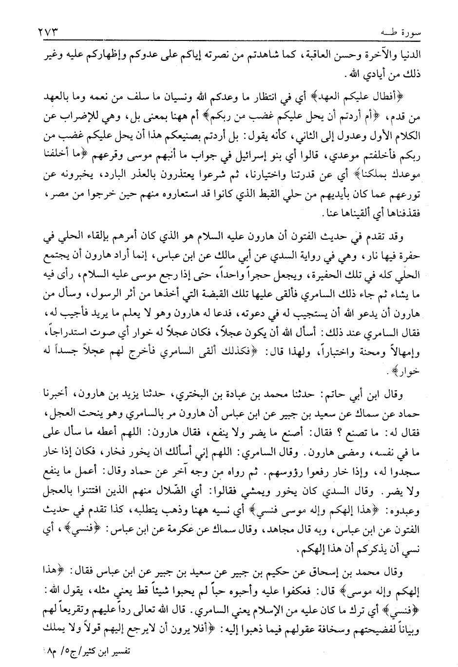 وَقَالَ ابْنُ أَبِي حَاتِمٍ: حَدَّثَنَا مُحَمَّدُ بْنُ عُبَادَةَ بْنِ الْبَخْتَرِيِّ، حَدَّثَنَا يَزِيدُ بْنُ هَارُونَ، أَخْبَرَنَا حَمَّادٌ عَنْ سِمَاكٍ عَنْ سَعِيدِ بْنِ جُبَيْرٍ عَنِ ابْنِ عَبَّاسٍ أن هَارُونَ مَرَّ بِالسَّامِرِيِّ وَهُوَ يَنْحِتُ الْعِجْلَ، فَقَالَ لَهُ: مَا تَصْنَعُ؟ فَقَالَ: أَصْنَعُ مَا يَضُرُّ وَلَا يَنْفَعُ، فَقَالَ هَارُونُ: اللَّهُمَّ أَعْطِهِ مَا سَأَلَ عَلَى مَا فِي نَفْسِهِ، وَمَضَى هَارُونُ. وقال السَّامِرِيُّ: اللَّهُمَّ إِنِّي أَسْأَلُكَ أَنْ يَخُورَ فَخَارَ، فَكَانَ إِذَا خَارَ سَجَدُوا لَهُ، وَإِذَا خَارَ رَفَعُوا رُؤُوسَهُمْ. ثُمَّ رَوَاهُ مِنْ وَجْهٍ آخَرَ عَنْ حَمَّادٍ وَقَالَ: أَعْمَلُ مَا يَنْفَعُ وَلَا يَضُرُّ. وَقَالَ السُّدِّيُّ كَانَ يَخُورُ وَيَمْشِي فَقَالُوا: أَيِ الضُّلَّالُ مِنْهُمُ الَّذِينَ افْتُتِنُوا بِالْعِجْلِ وَعَبَدُوهُ: هَذَا إِلهُكُمْ وَإِلهُ مُوسى فَنَسِيَ أَيْ نَسِيَهُ هَاهُنَا وَذَهَبَ يَتَطَلَّبُهُ، كَذَا تَقَدَّمَ فِي حَدِيثِ الْفُتُونِ عَنِ ابْنِ عَبَّاسٍ، وَبِهِ قَالَ مُجَاهِدٌ، وَقَالَ سِمَاكٌ عَنْ عِكْرِمَةَ عَنِ ابْنِ عَبَّاسٍ: فَنَسِيَ، أَيْ نَسِيَ أَنْ يُذَكِّرَكُمْ أَنَّ هَذَا إِلَهُكُمْ.