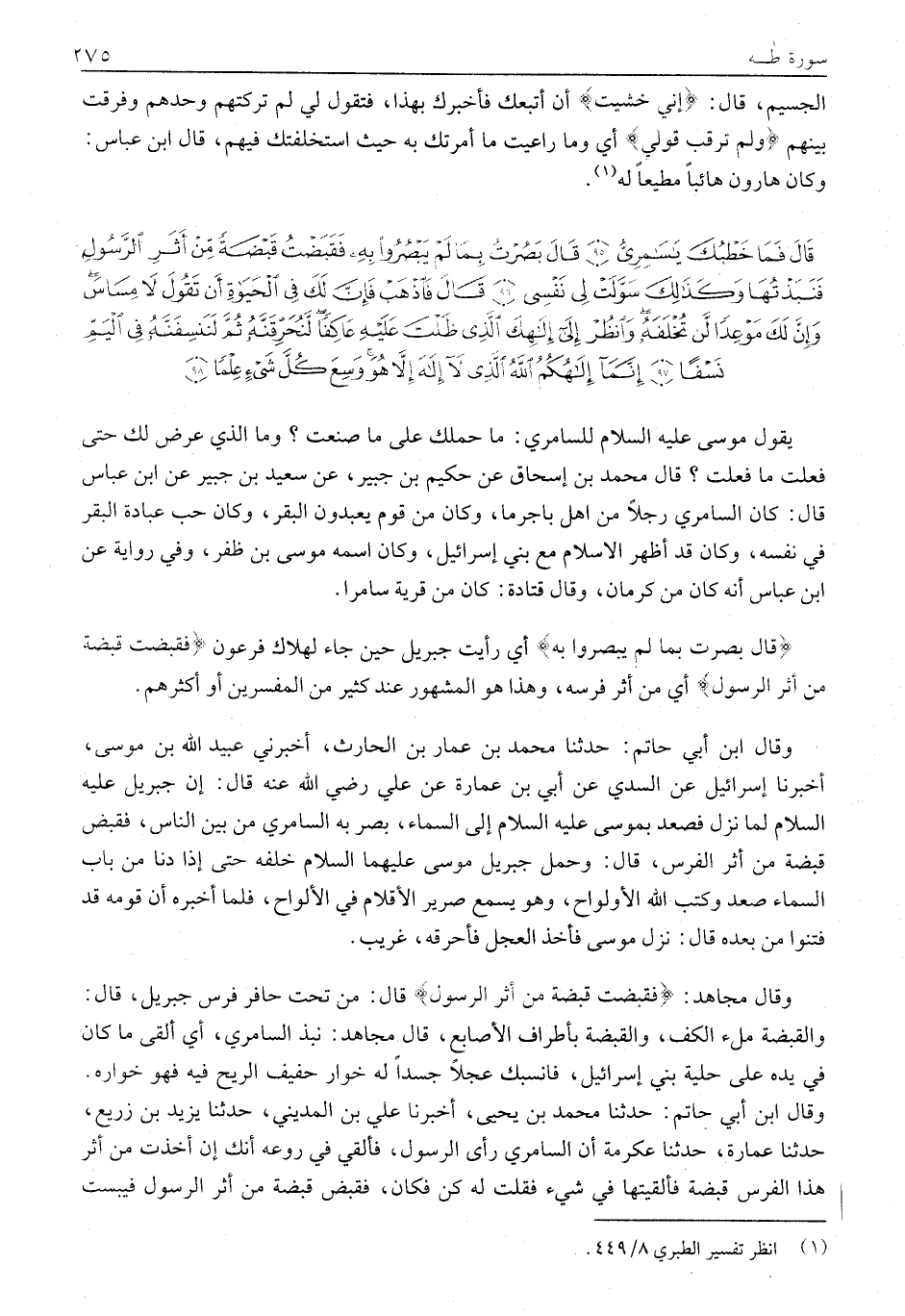 قالَ فَما خَطْبُكَ يا سامِرِيُّ (95) قالَ بَصُرْتُ بِما لَمْ يَبْصُرُوا بِهِ فَقَبَضْتُ قَبْضَةً مِنْ أَثَرِ الرَّسُولِ فَنَبَذْتُها وَكَذلِكَ سَوَّلَتْ لِي نَفْسِي (96) قالَ فَاذْهَبْ فَإِنَّ لَكَ فِي الْحَياةِ أَنْ تَقُولَ لَا مِساسَ وَإِنَّ لَكَ مَوْعِداً لَنْ تُخْلَفَهُ وَانْظُرْ إِلى إِلهِكَ الَّذِي ظَلْتَ عَلَيْهِ عاكِفاً لَنُحَرِّقَنَّهُ ثُمَّ لَنَنْسِفَنَّهُ فِي الْيَمِّ نَسْفاً (97) إِنَّما إِلهُكُمُ اللَّهُ الَّذِي لَا إِلهَ إِلاَّ هُوَ وَسِعَ كُلَّ شَيْءٍ عِلْماً (98)