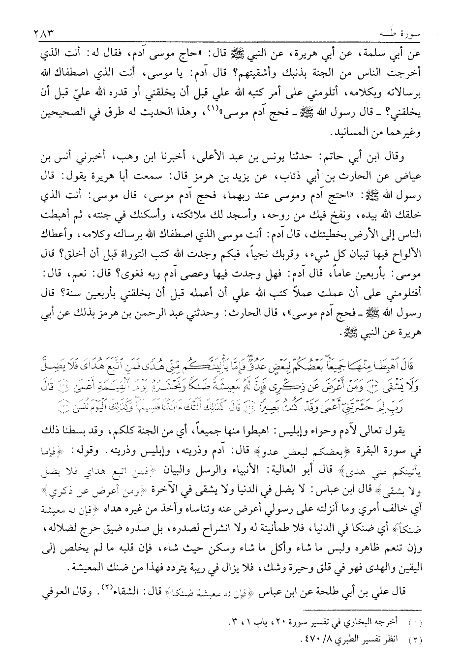 عَنْ أَبِي سَلَمَةَ، عَنْ أَبِي هُرَيْرَةَ، عَنِ النَّبِيِّ صَلَّى اللَّهُ عَلَيْهِ وَسَلَّمَ قَالَ: «حَاجَّ مُوسَى آدَمَ، فَقَالَ لَهُ: أَنْتَ الَّذِي أَخْرَجْتَ النَّاسَ مِنَ الْجَنَّةِ بِذَنْبِكَ وَأَشْقَيْتَهُمْ؟ قَالَ آدَمُ: يَا مُوسَى، أَنْتَ الَّذِي اصْطَفَاكَ اللَّهُ بِرِسَالَاتِهِ وبكلامه، أتلومني على أمر كَتَبَهُ اللَّهُ عَلَيَّ قَبْلَ أَنْ يَخْلُقَنِي أَوْ قَدَّرَهُ اللَّهُ عَلَيَّ قَبْلَ أَنْ يَخْلُقَنِي؟ - قَالَ رَسُولُ اللَّهِ صَلَّى اللَّهُ عَلَيْهِ وَسَلَّمَ- فَحَجَّ آدَمُ مُوسَى» «1» ، وَهَذَا الْحَدِيثُ لَهُ طُرُقٌ فِي الصَّحِيحَيْنِ وَغَيْرِهِمَا مِنَ الْمَسَانِيدِ.