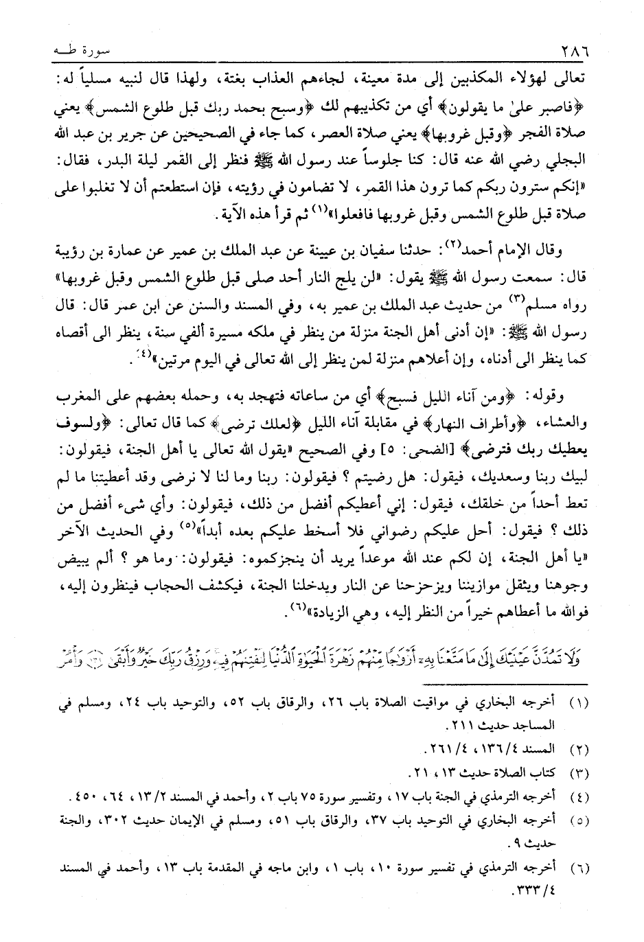 «إِنَّكُمْ سَتَرَوْنَ رَبَّكُمْ كَمَا تَرَوْنَ هَذَا الْقَمَرَ، لَا تُضَامُونَ فِي رُؤْيَتِهِ، فَإِنِ استطعتم أن لا تُغْلَبُوا عَلَى صَلَاةٍ قَبْلَ طُلُوعِ الشَّمْسِ وَقَبْلَ غُرُوبِهَا فَافْعَلُوا» «1» ثُمَّ قَرَأَ هَذِهِ الْآيَةَ.
