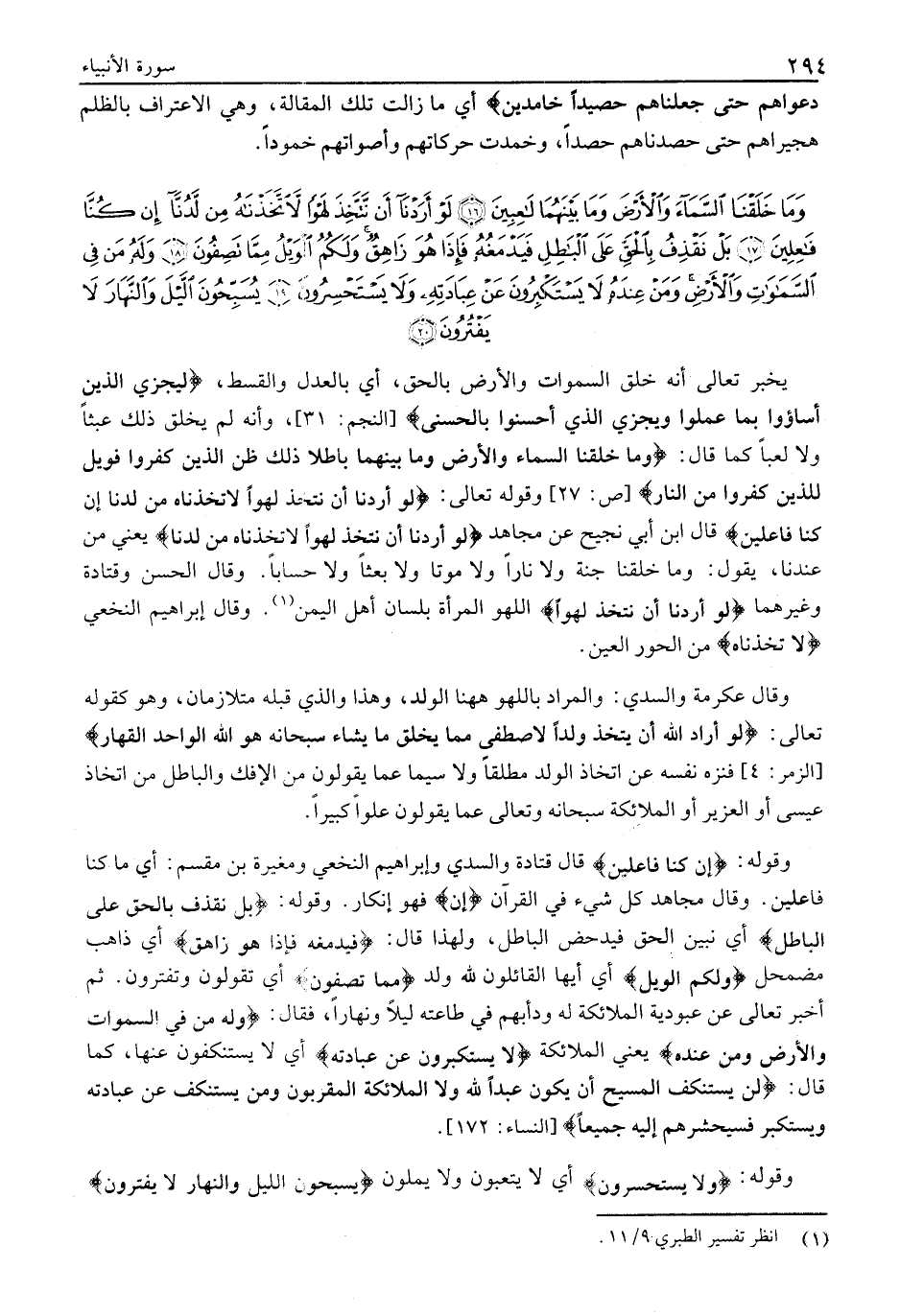 وَما خَلَقْنَا السَّماءَ وَالْأَرْضَ وَما بَيْنَهُما لاعِبِينَ (16) لَوْ أَرَدْنا أَنْ نَتَّخِذَ لَهْواً لاتَّخَذْناهُ مِنْ لَدُنَّا إِنْ كُنَّا فاعِلِينَ (17) بَلْ نَقْذِفُ بِالْحَقِّ عَلَى الْباطِلِ فَيَدْمَغُهُ فَإِذا هُوَ زاهِقٌ وَلَكُمُ الْوَيْلُ مِمَّا تَصِفُونَ (18) وَلَهُ مَنْ فِي السَّماواتِ وَالْأَرْضِ وَمَنْ عِنْدَهُ لَا يَسْتَكْبِرُونَ عَنْ عِبادَتِهِ وَلا يَسْتَحْسِرُونَ (19) يُسَبِّحُونَ اللَّيْلَ وَالنَّهارَ لَا يَفْتُرُونَ (20)