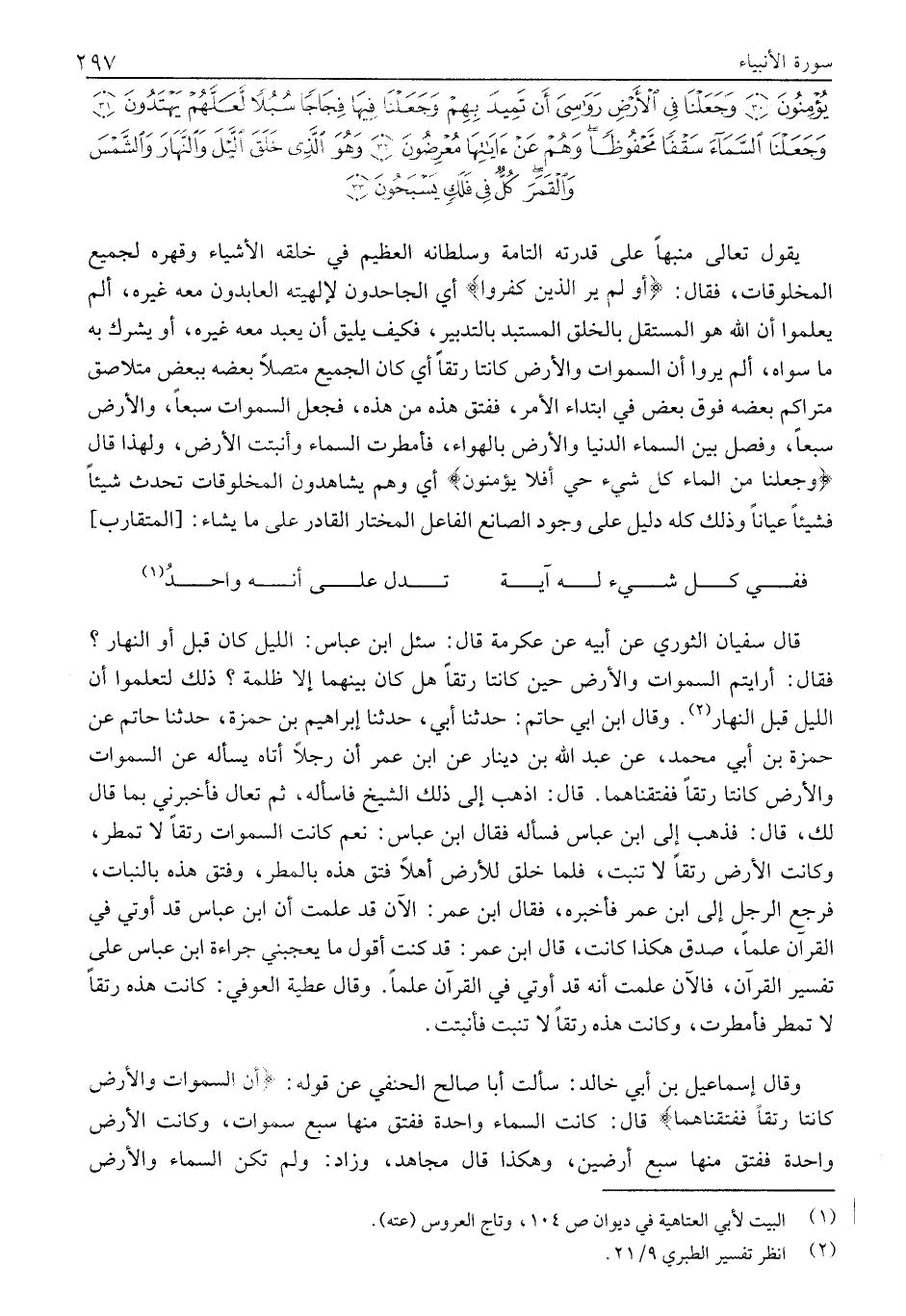 أَوَلَمْ يَرَ الَّذِينَ كَفَرُوا أَنَّ السَّماواتِ وَالْأَرْضَ كانَتا رَتْقاً فَفَتَقْناهُما وَجَعَلْنا مِنَ الْماءِ كُلَّ شَيْءٍ حَيٍّ أَفَلا يُؤْمِنُونَ (30) وَجَعَلْنا فِي الْأَرْضِ رَواسِيَ أَنْ تَمِيدَ بِهِمْ وَجَعَلْنا فِيها فِجاجاً سُبُلاً لَعَلَّهُمْ يَهْتَدُونَ (31) وَجَعَلْنَا السَّماءَ سَقْفاً مَحْفُوظاً وَهُمْ عَنْ آياتِها مُعْرِضُونَ (32) وَهُوَ الَّذِي خَلَقَ اللَّيْلَ وَالنَّهارَ وَالشَّمْسَ وَالْقَمَرَ كُلٌّ فِي فَلَكٍ يَسْبَحُونَ (33)