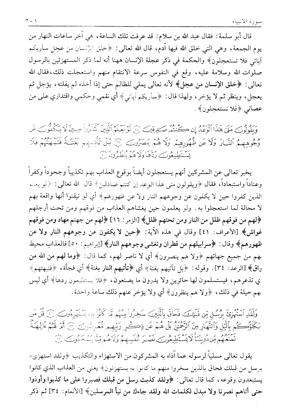 قَالَ أَبُو سَلَمَةَ: فَقَالَ عَبْدُ اللَّهِ بْنُ سلام: قد عرفت تلك الساعة، هي آخِرُ سَاعَاتِ النَّهَارِ مِنْ يَوْمِ الْجُمُعَةِ، وَهِيَ الَّتِي خَلَقَ اللَّهُ فِيهَا آدَمَ، قَالَ اللَّهُ تَعَالَى: خُلِقَ الْإِنْسانُ مِنْ عَجَلٍ سَأُرِيكُمْ آياتِي فَلا تَسْتَعْجِلُونِ وَالْحِكْمَةُ فِي ذِكْرِ عِجَلَةِ الْإِنْسَانِ هَاهُنَا أَنَّهُ لَمَّا ذَكَرَ الْمُسْتَهْزِئِينَ بِالرَّسُولِ صَلَوَاتُ اللَّهِ وَسَلَامُهُ عَلَيْهِ، وَقَعَ فِي النُّفُوسِ سُرْعَةُ الانتقام منهم واستعجلت ذلك، فَقَالَ اللَّهُ تَعَالَى: خُلِقَ الْإِنْسانُ مِنْ عَجَلٍ لِأَنَّهُ تَعَالَى يُمْلِي لِلظَّالِمِ حَتَّى إِذَا أَخَذَهُ لَمْ يُفْلِتْهُ، يُؤَجِّلُ ثُمَّ يُعَجِّلُ، وَيُنْظِرُ ثُمَّ لا يؤخر، ولهذا قال: سَأُرِيكُمْ آياتِي أَيْ نَقْمِي وَحُكْمِي وَاقْتِدَارِي عَلَى مَنْ عصاني فَلا تَسْتَعْجِلُونِ.